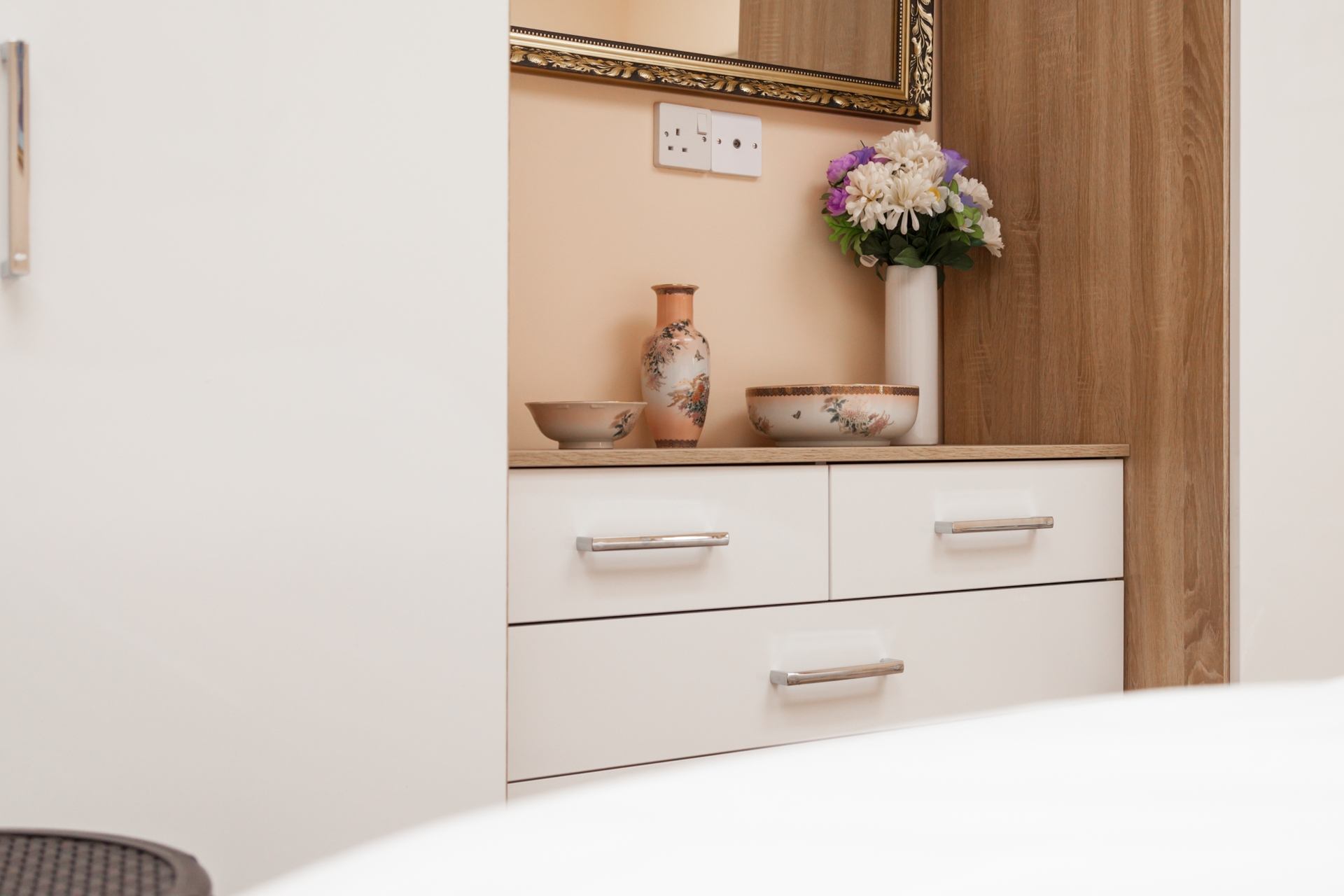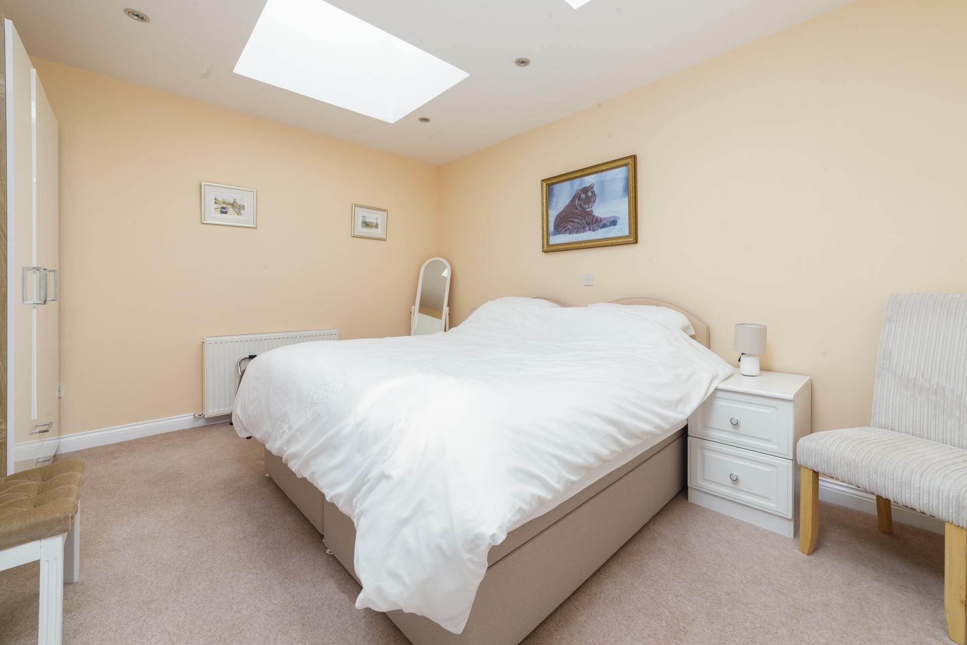 Bedroom: Super king size bed (that can be made up as a twin on request), bedside cabinets, occasional chair, built-in wardrobes and chest of drawers.
