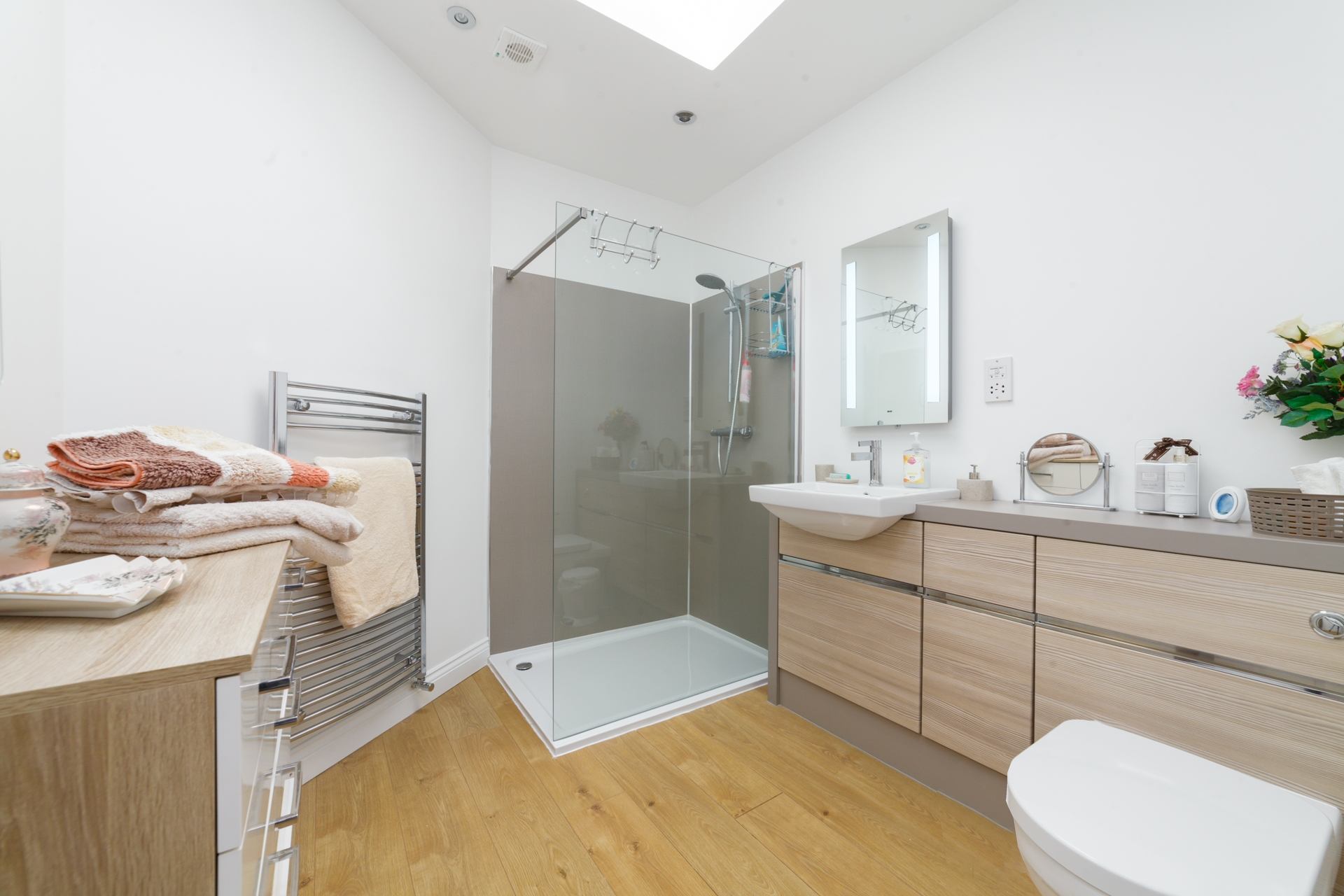 Bathroom: Walk-in shower, wash hand basin and WC.