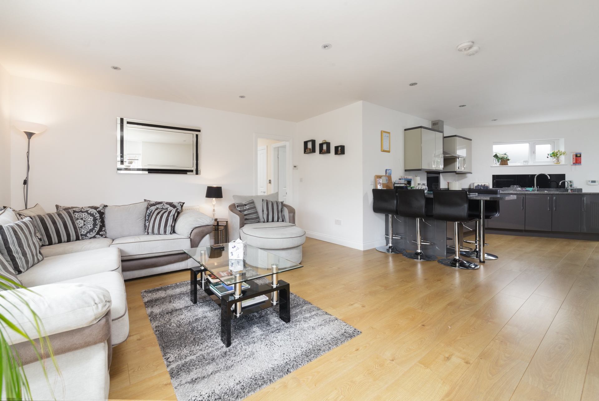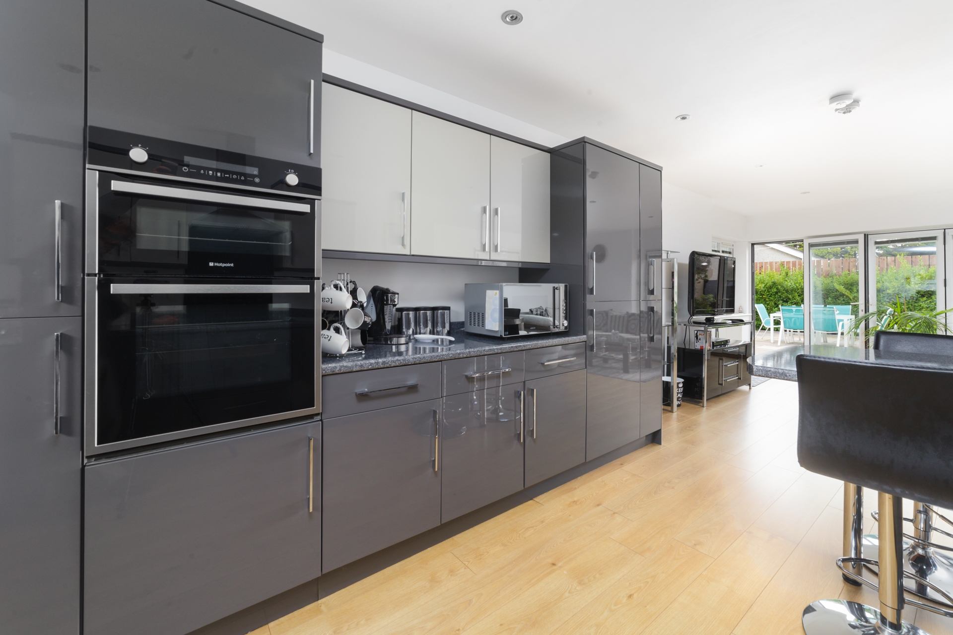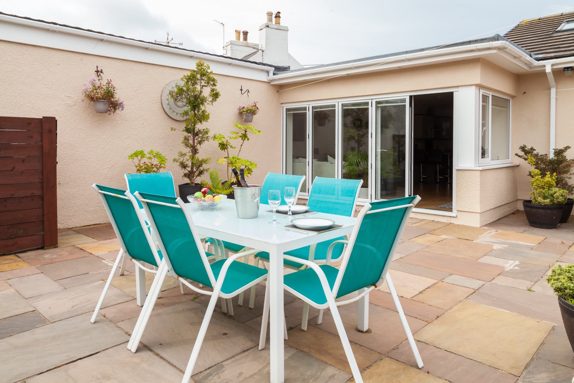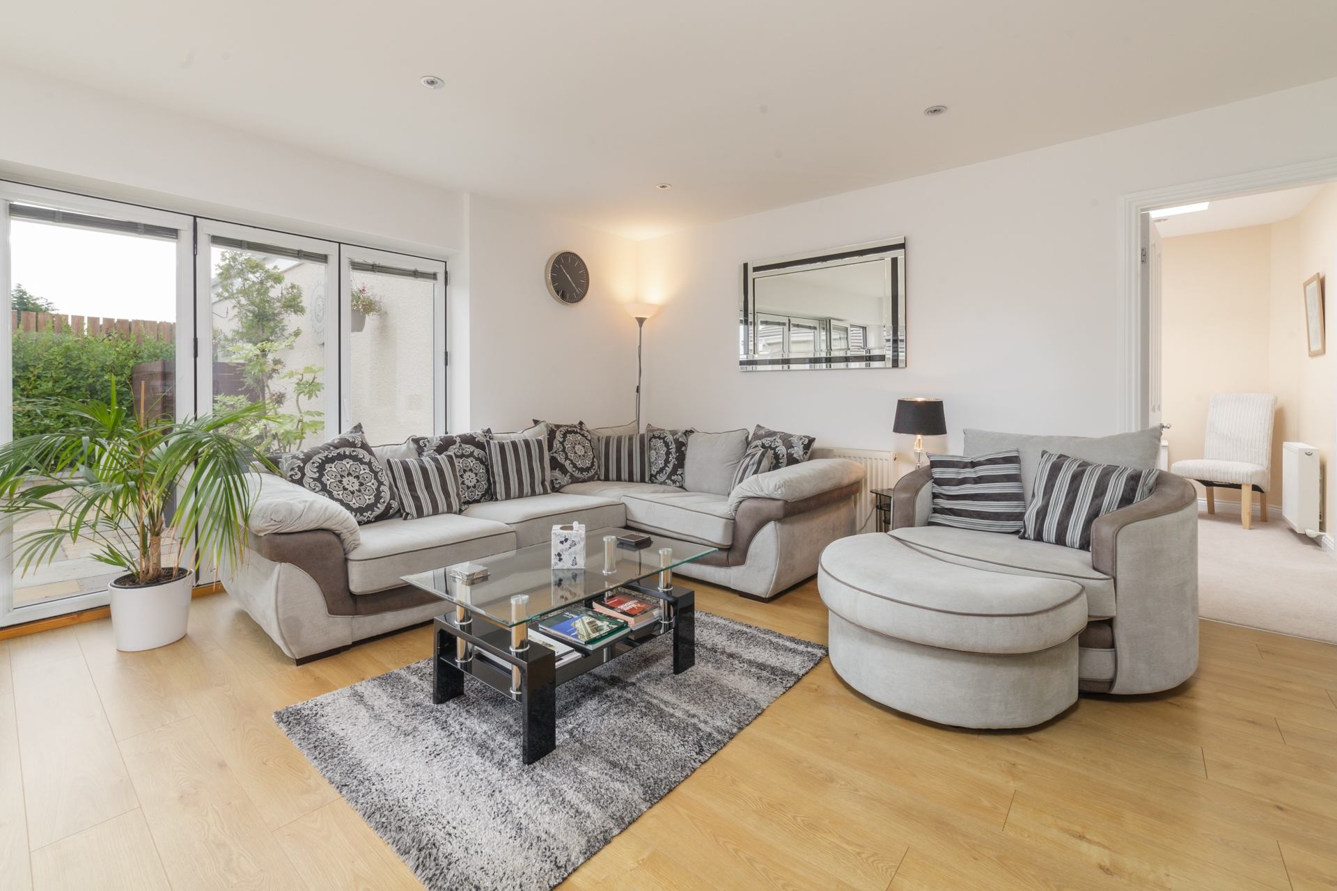Living Room: Large L-shaped sofa and armchair, TV and coffee table. Bi-fold doors into courtyard.