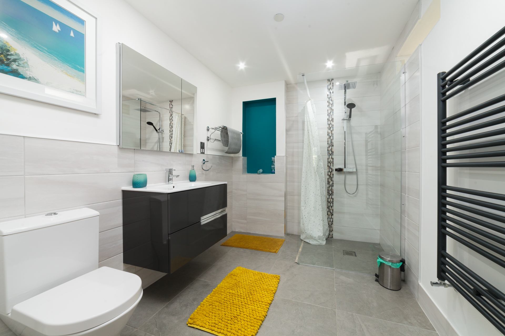 Bathroom: Spacious walk-in shower, wash basin and WC.