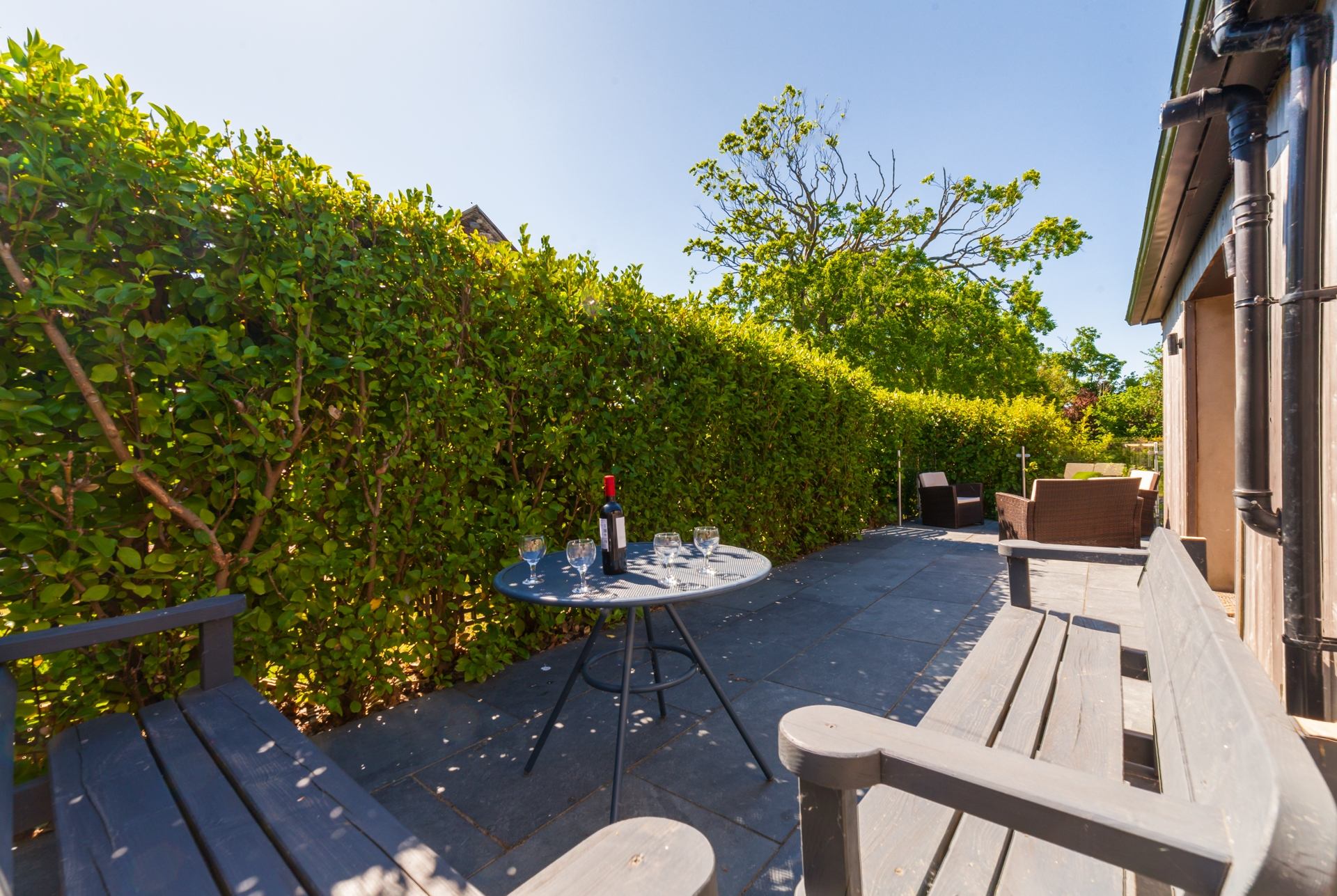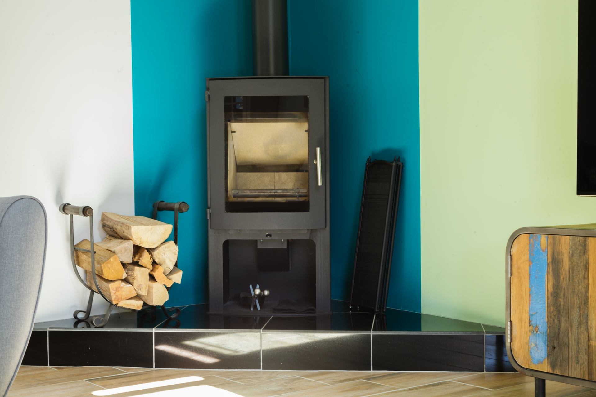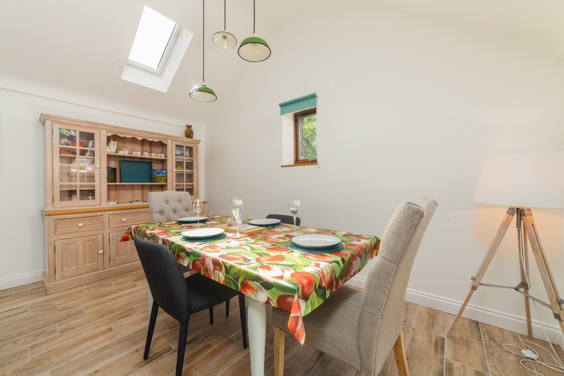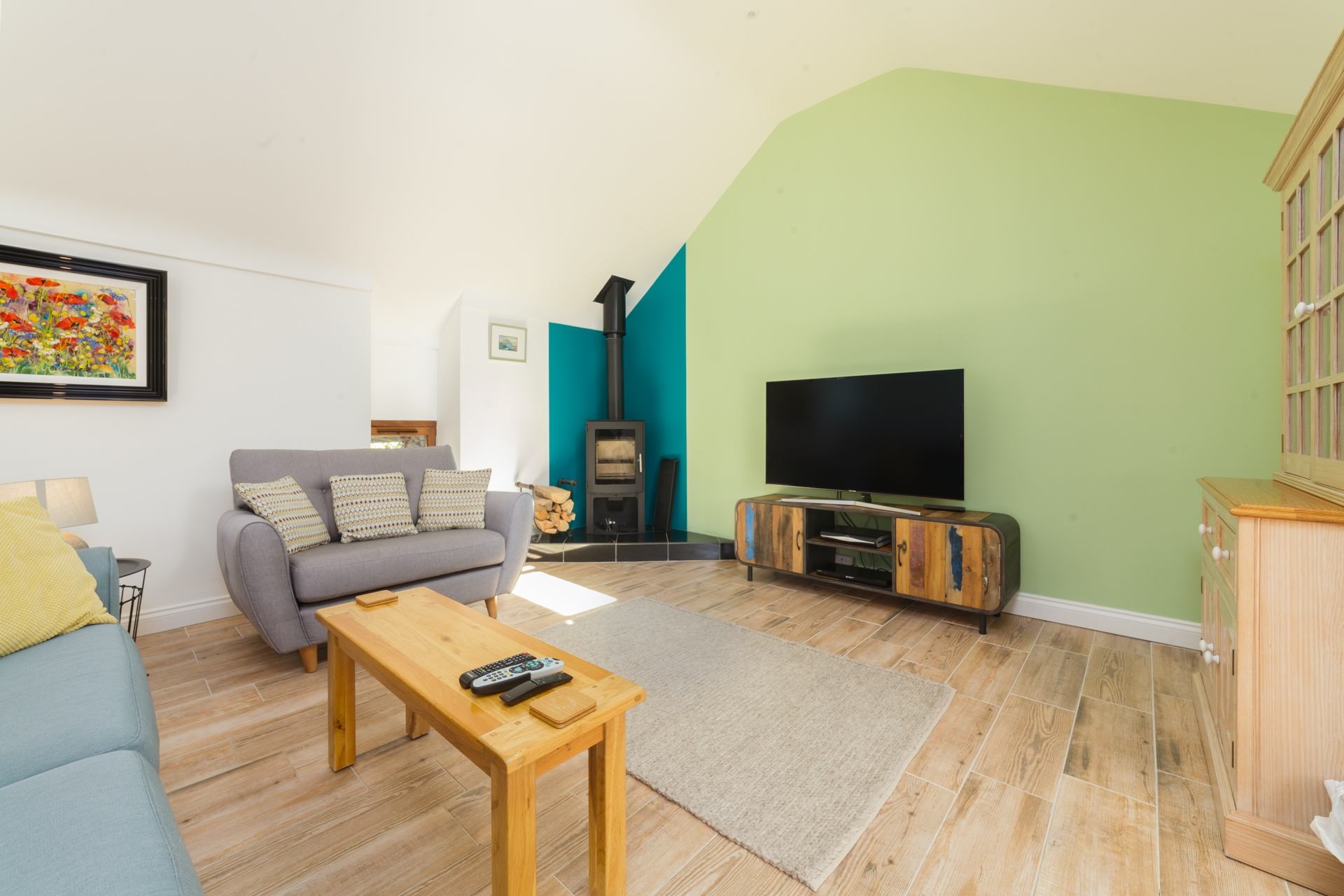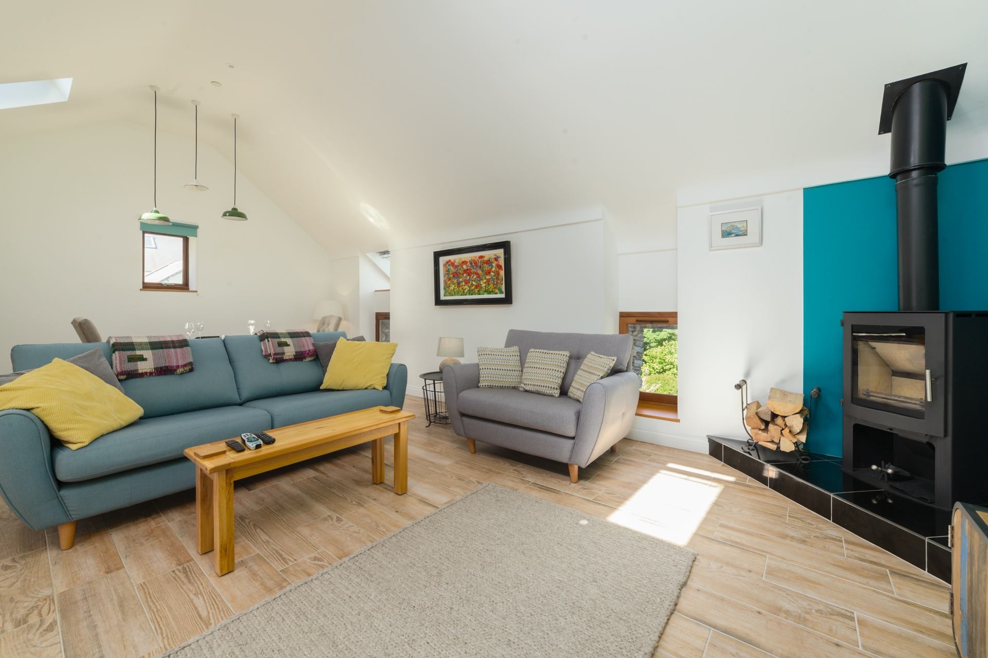 Living/Dining: Large open-plan space with dining table, comfortable seating, flat screen TV with Sky, WiFi, and a wood-burning stove.