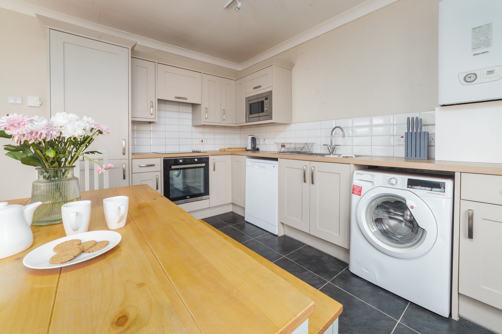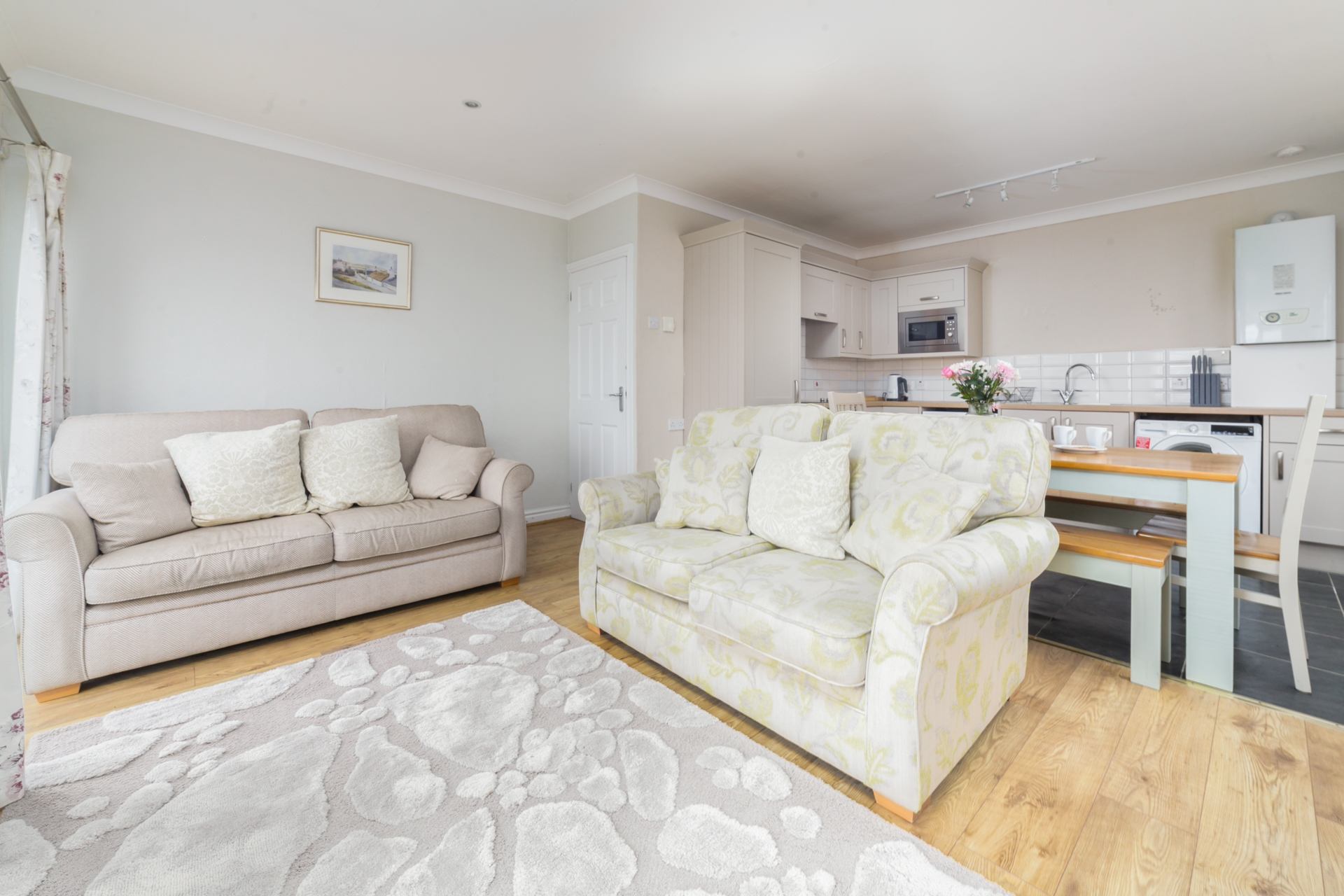 Kitchen, Living Room & Dining area: Comfortable sofa seating for 4, Smart TV, coffee table, dining table and four chairs. Well-equipped modern kitchen, containing hob, oven, fridge, freezer and microwave. Washer / dryer available to use.