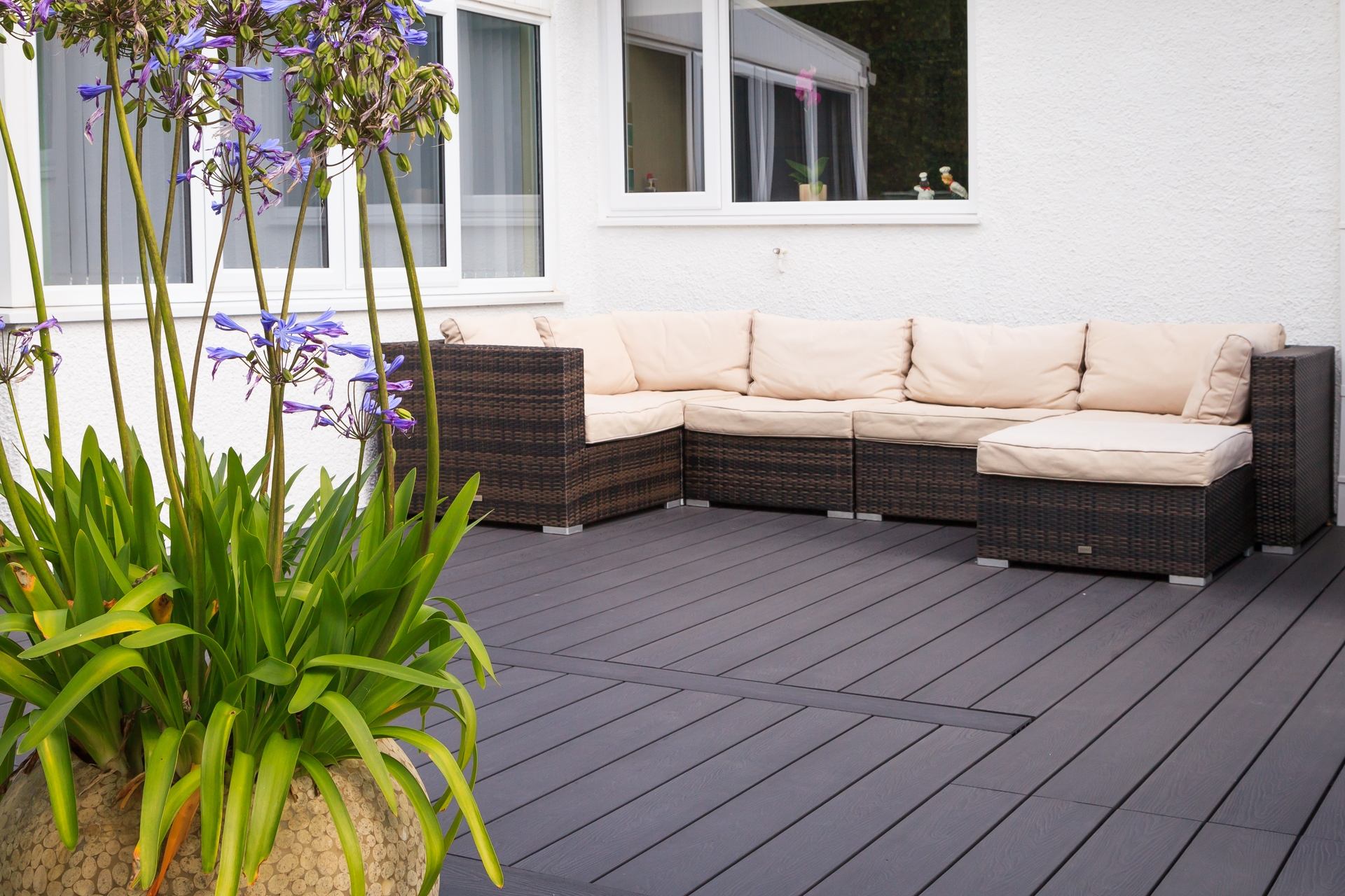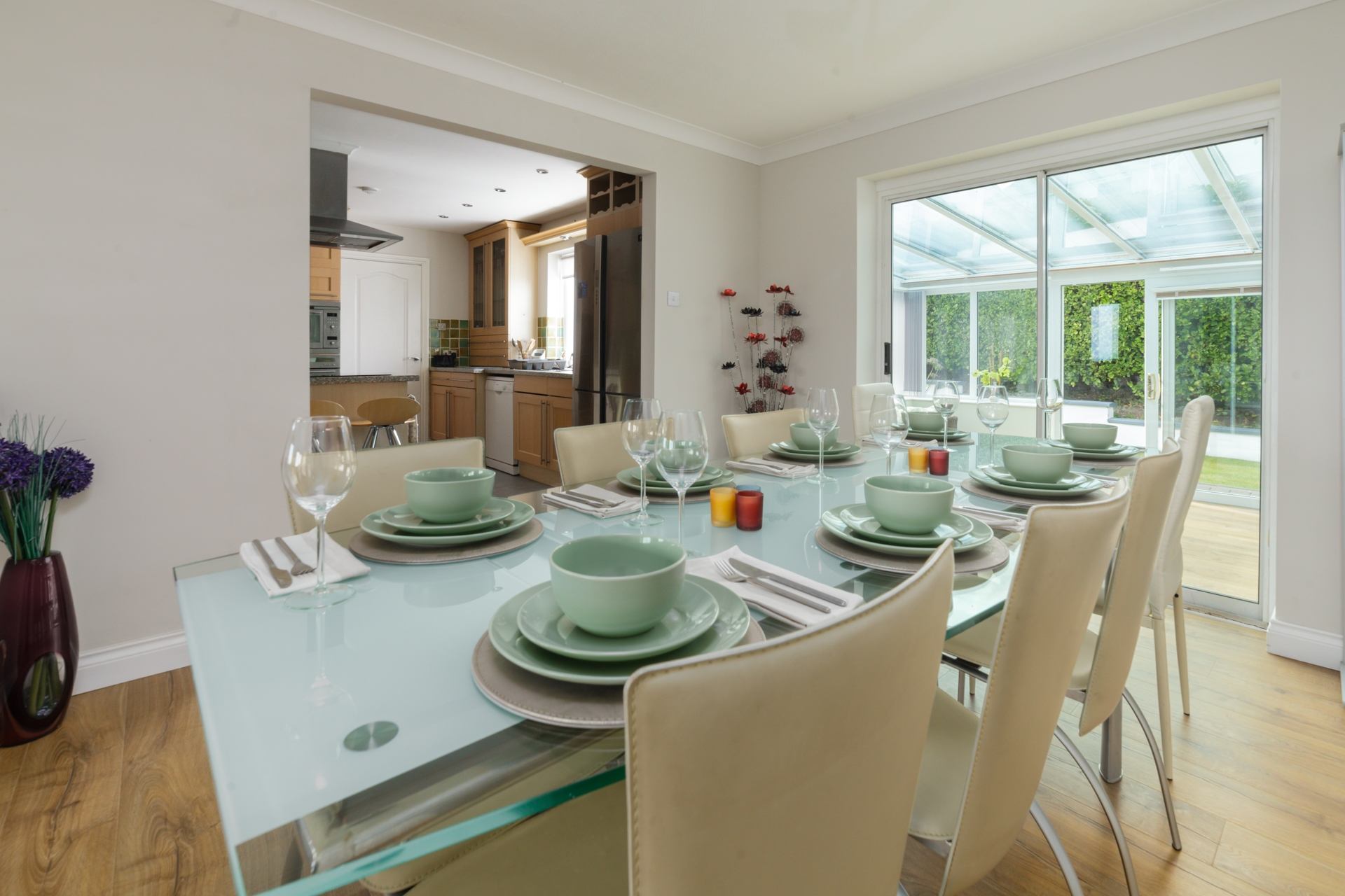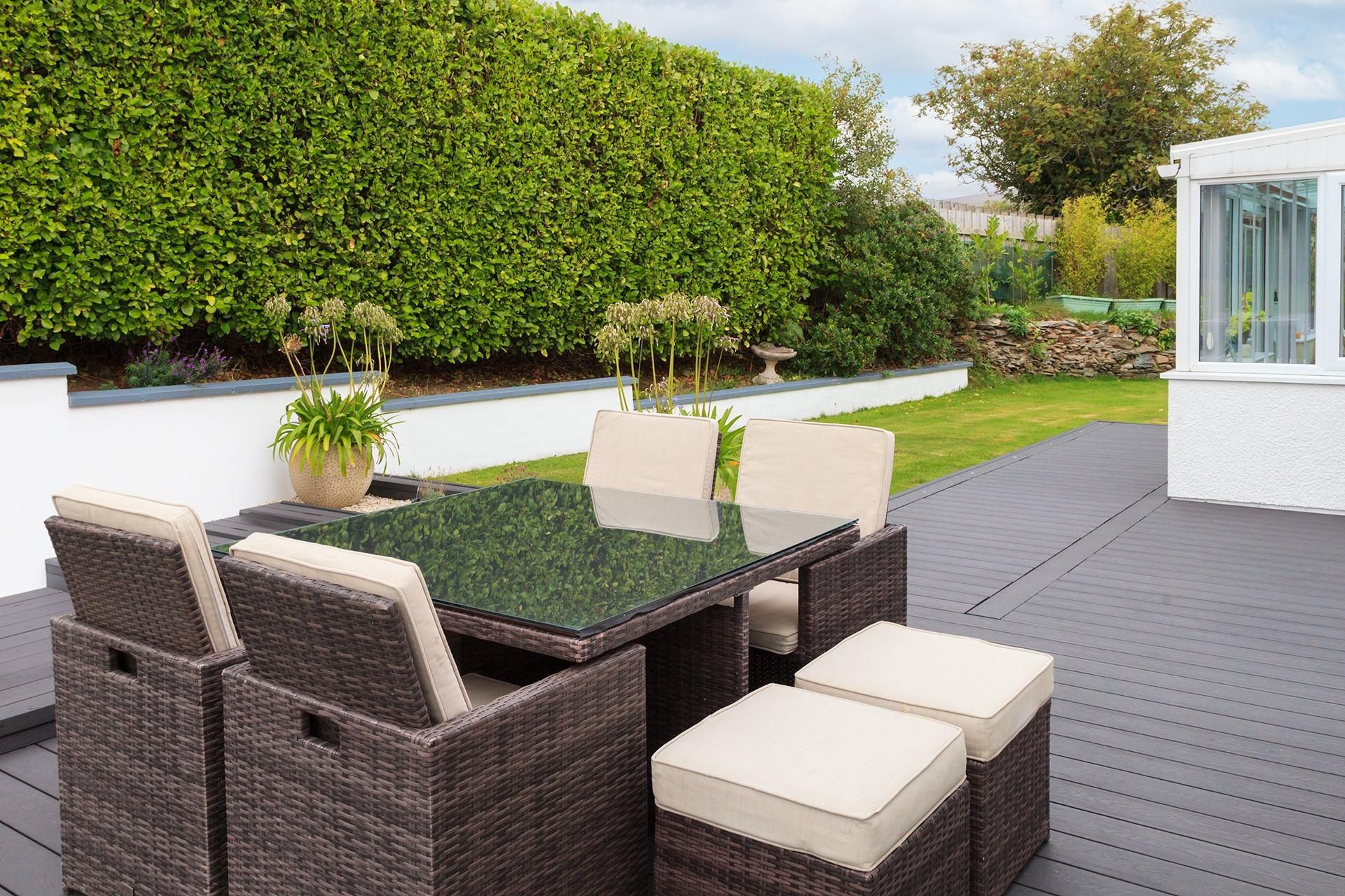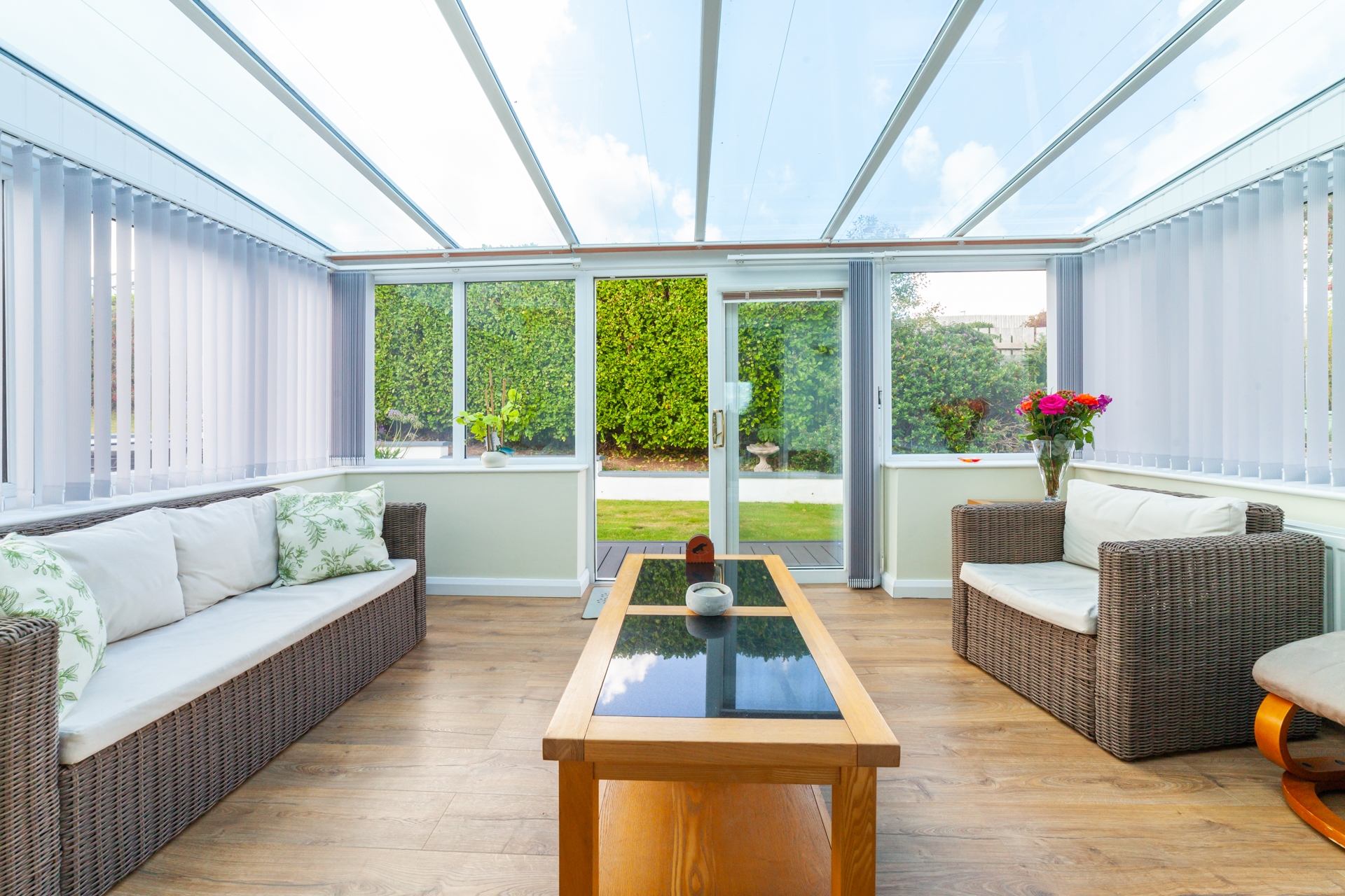 Conservatory: Sofa, chairs and coffee table with access to the garden.