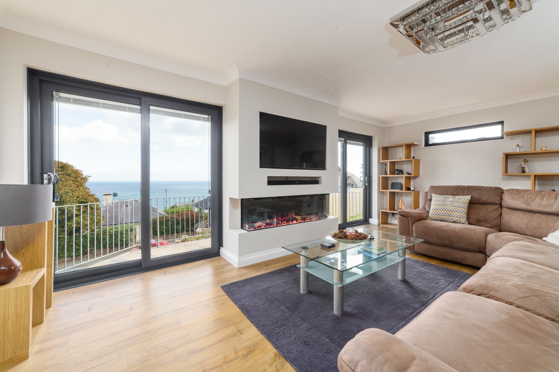 Living Area: Spacious lounge with comfortable L-shaped seating, large windows with sea views and Smart TV. Access to outdoor balcony through French doors.