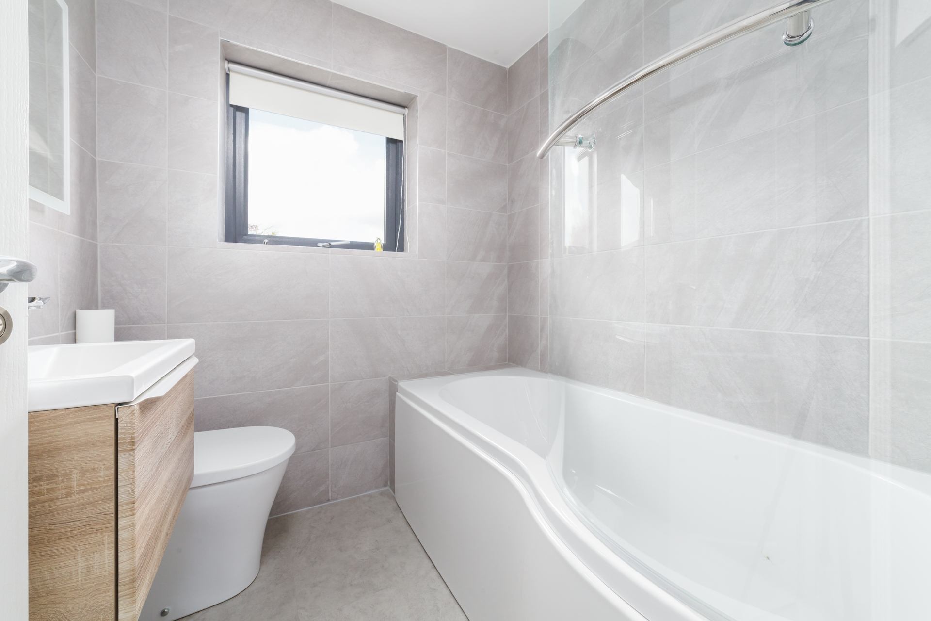 Family Bathroom: Modern suite with shower over bath, WC and wash hand basin.