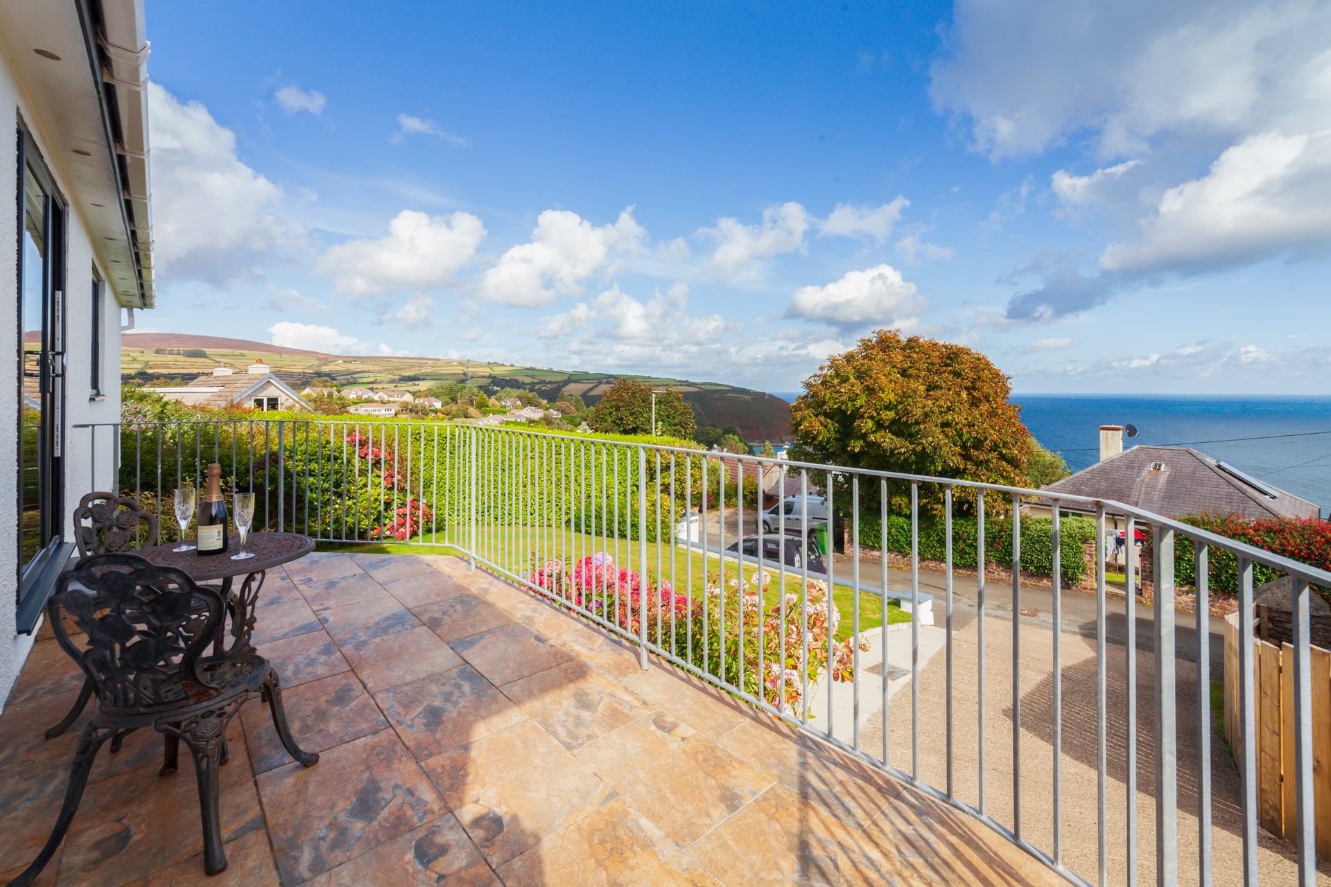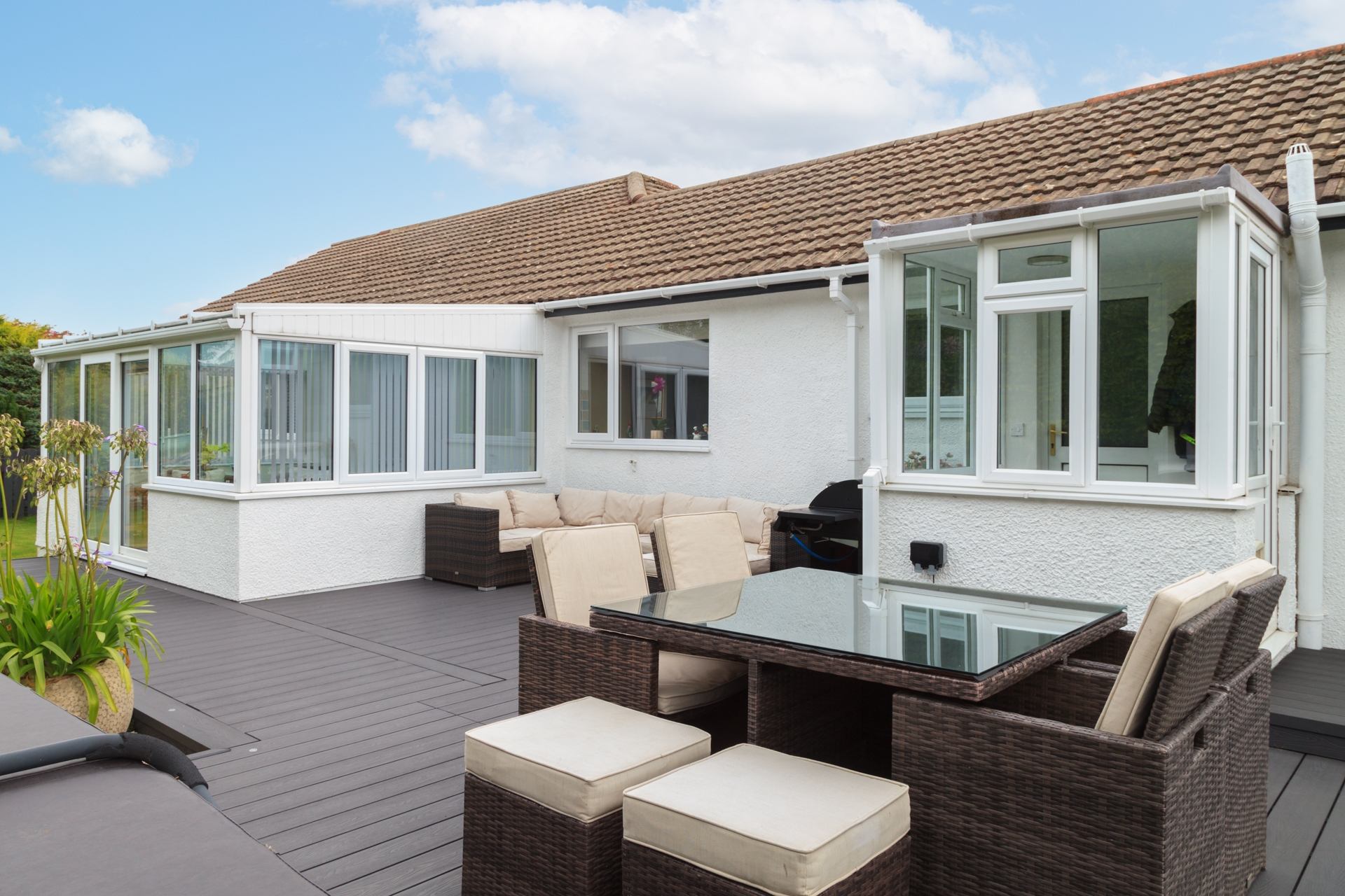Gardens: Gardens to front, side and rear featuring a table and chairs, patio furniture and BBQ - perfect for outdoor dining and enjoying the sea views.