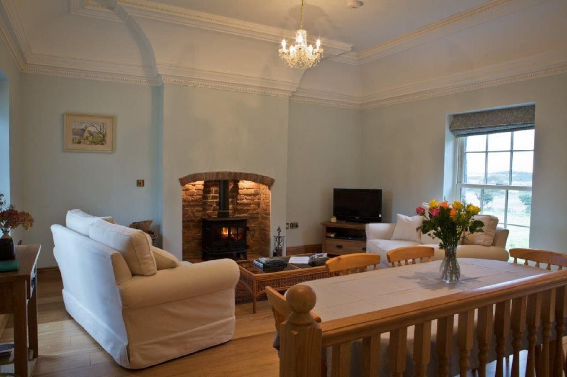 Lounge: Open plan area, two sofas, dining table with four chairs, TV, coffee table and log burning stove.