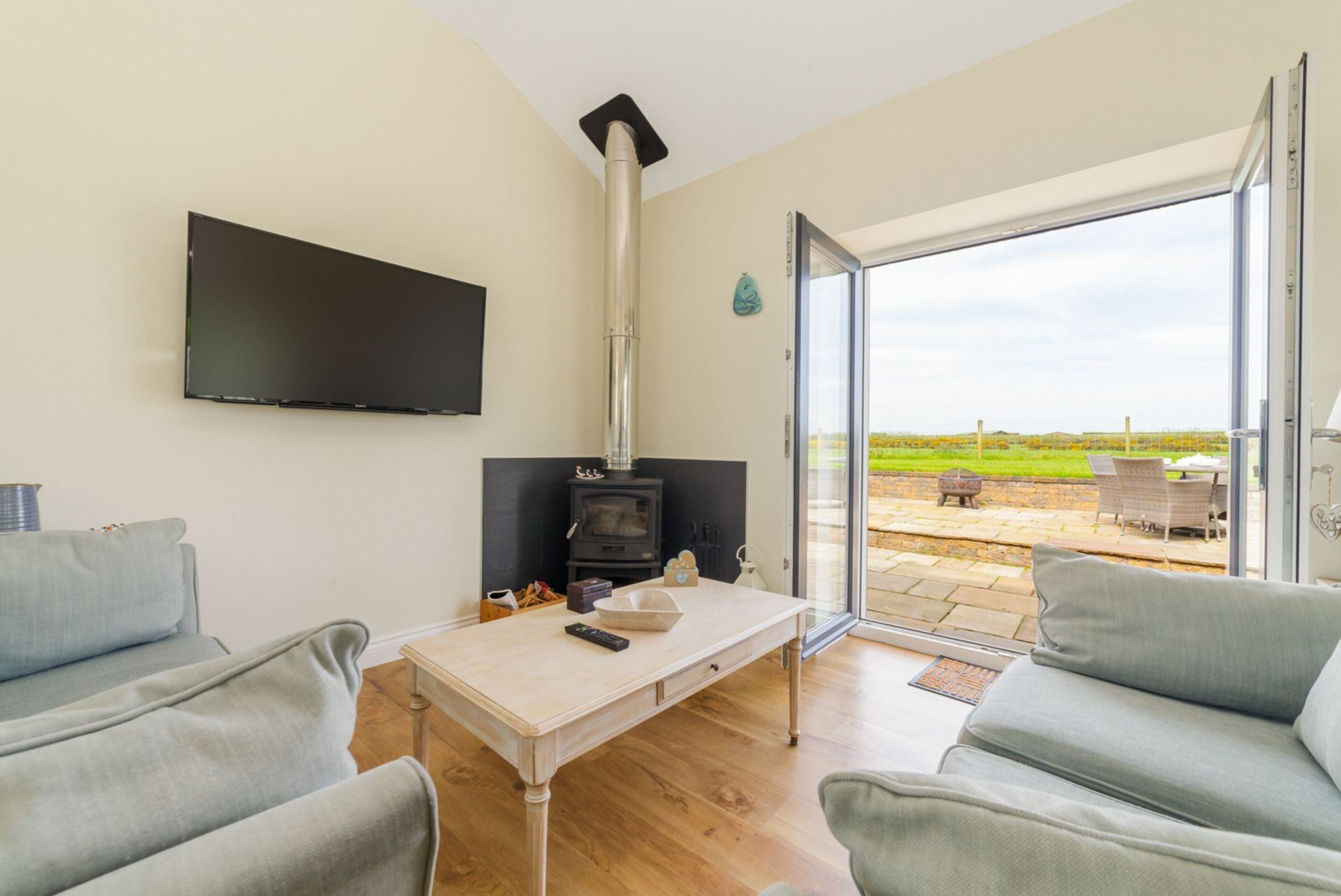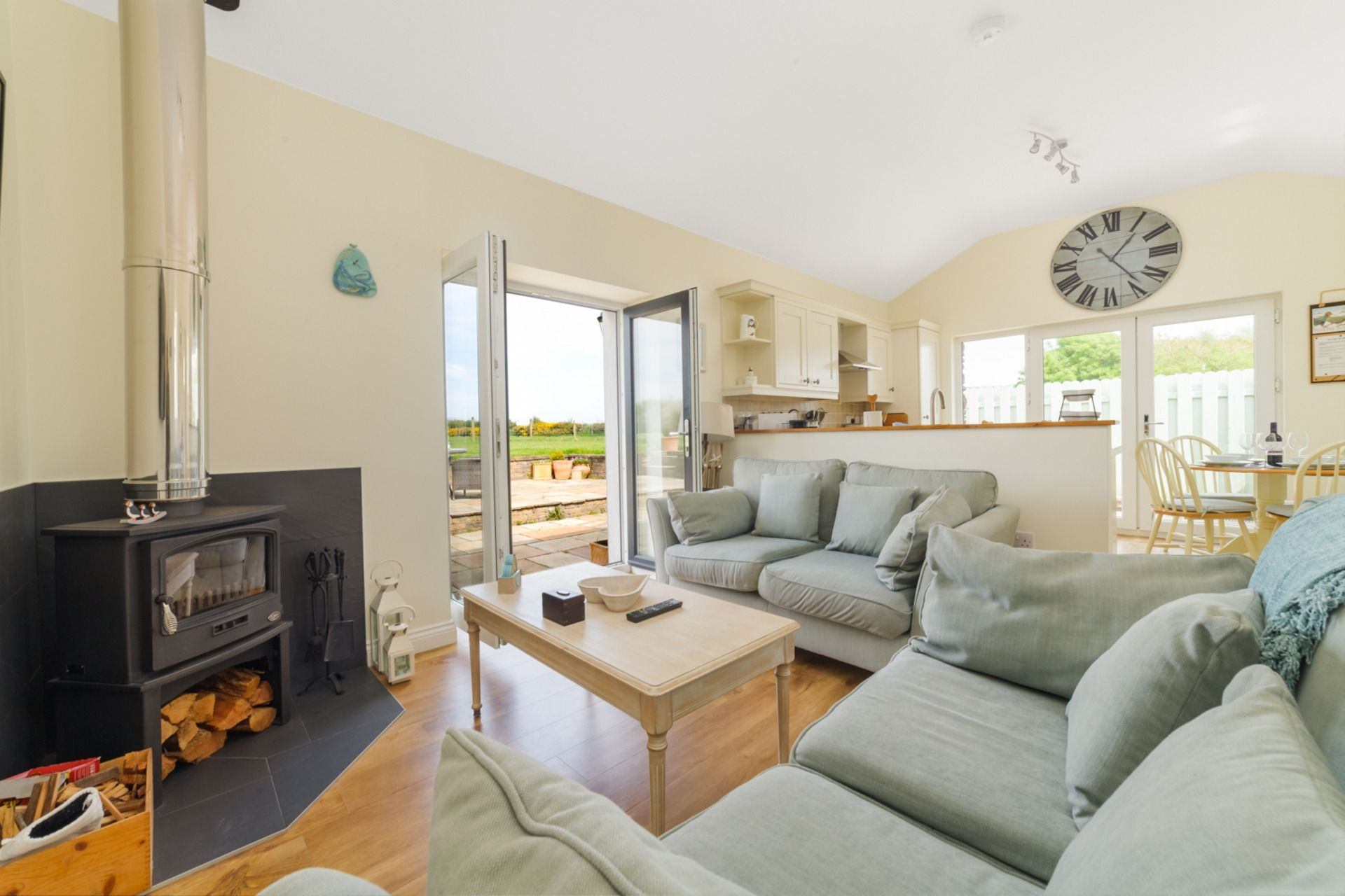 Living area: 2 comfortable sofas, coffee table, Smart TV, wood burner