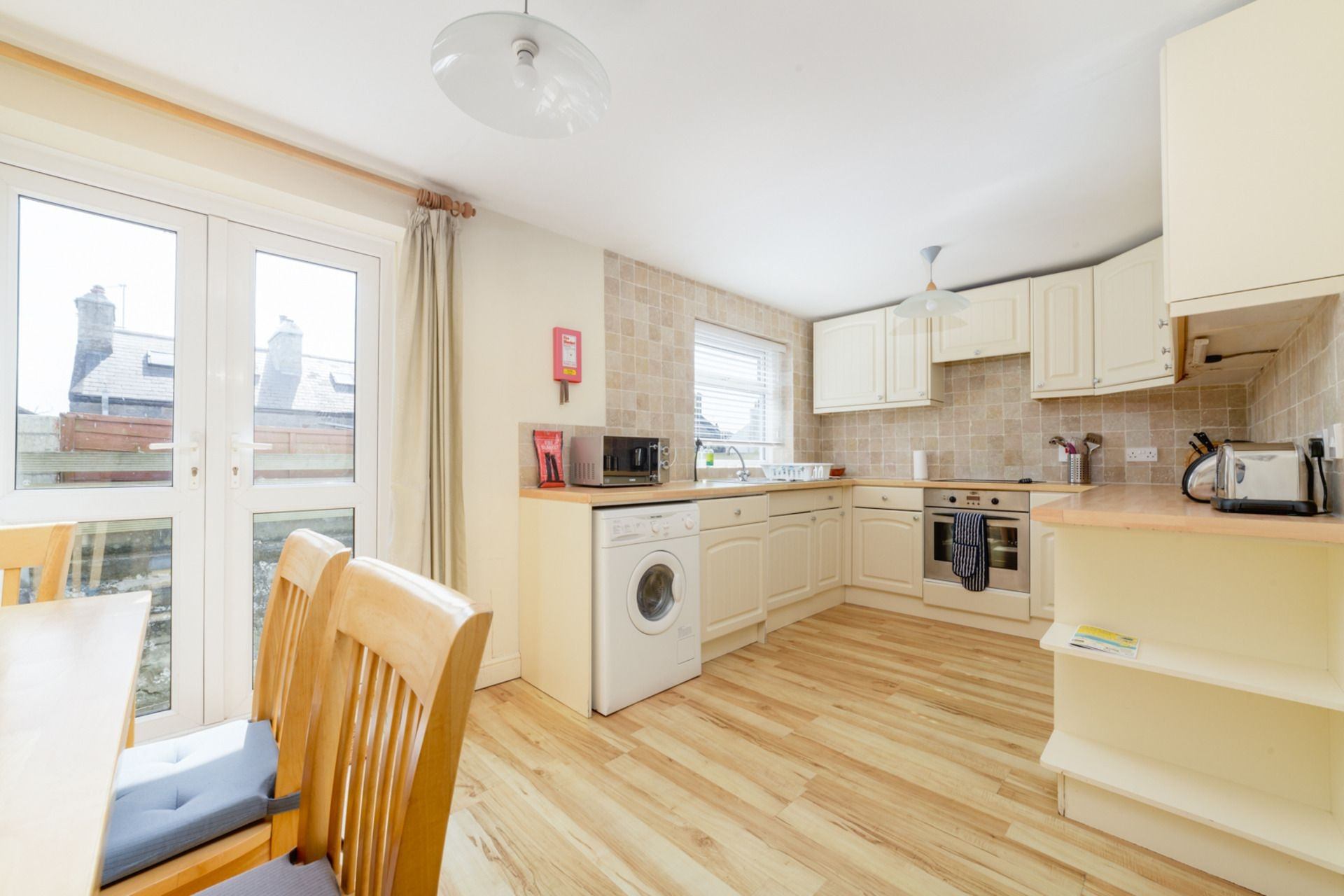 Kitchen/Dining area: Oven, hob, fridge/freezer, microwave, kettle, toaster, dishwasher and washing machine. There is also a dining table with 4 chairs