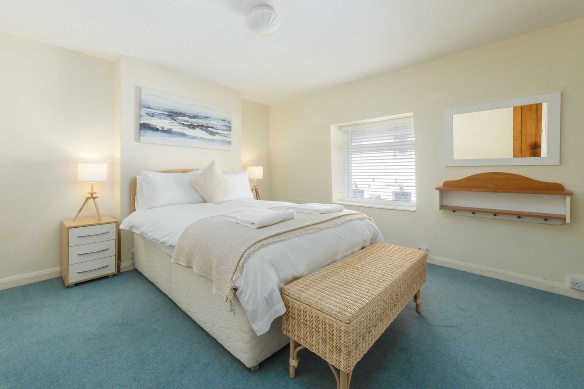 Bedroom 1: Double bed, bedside tables and wardrobe and drawers