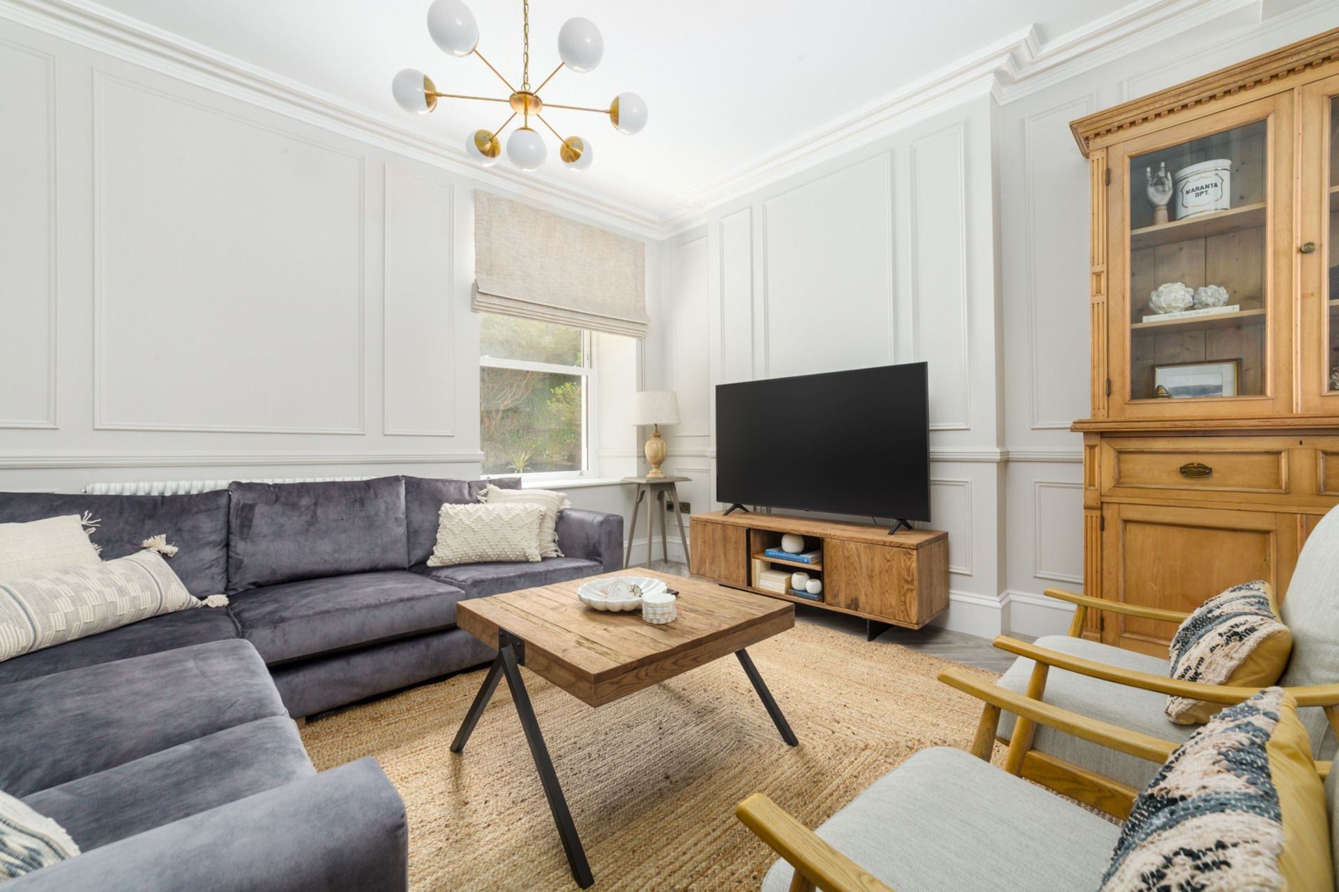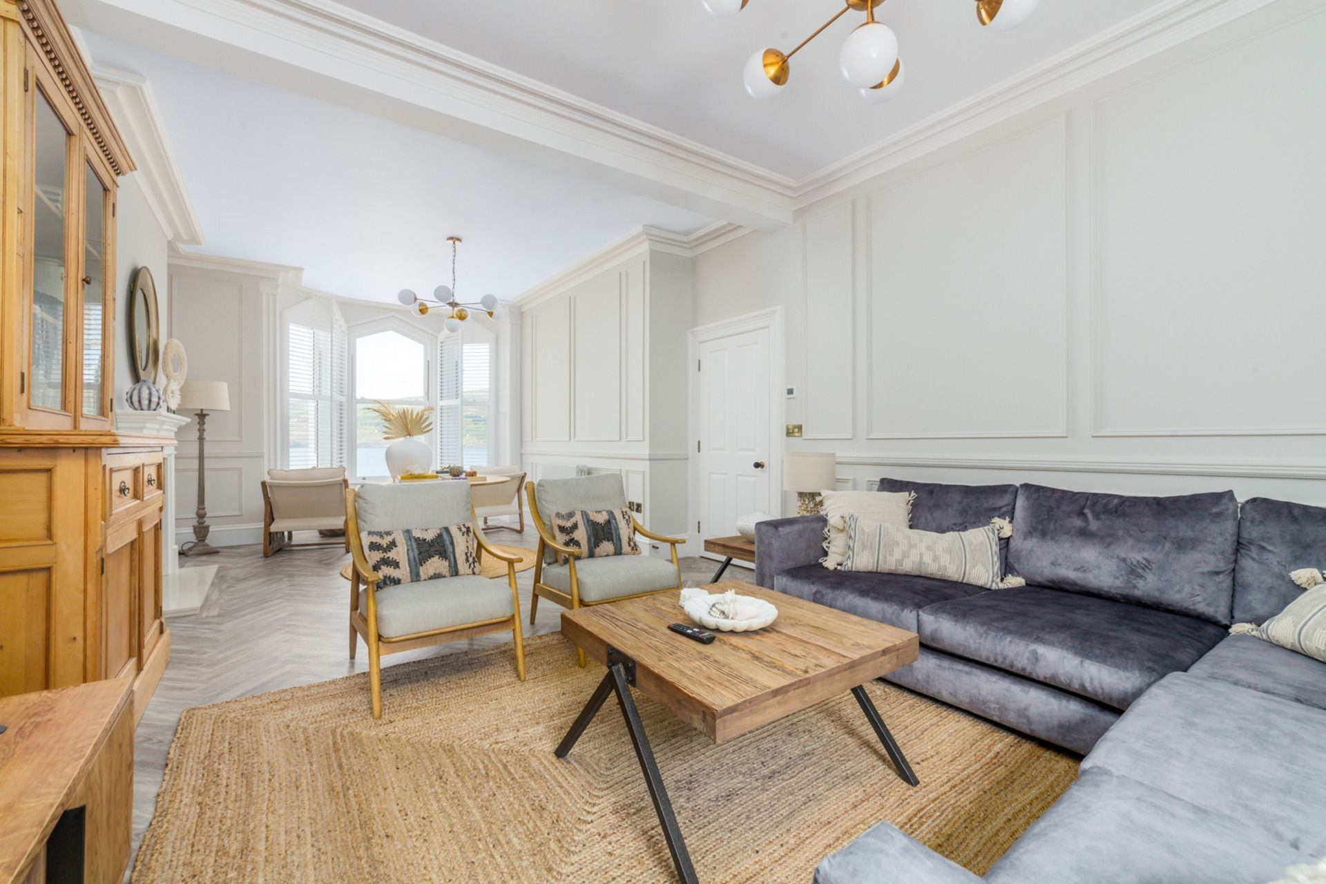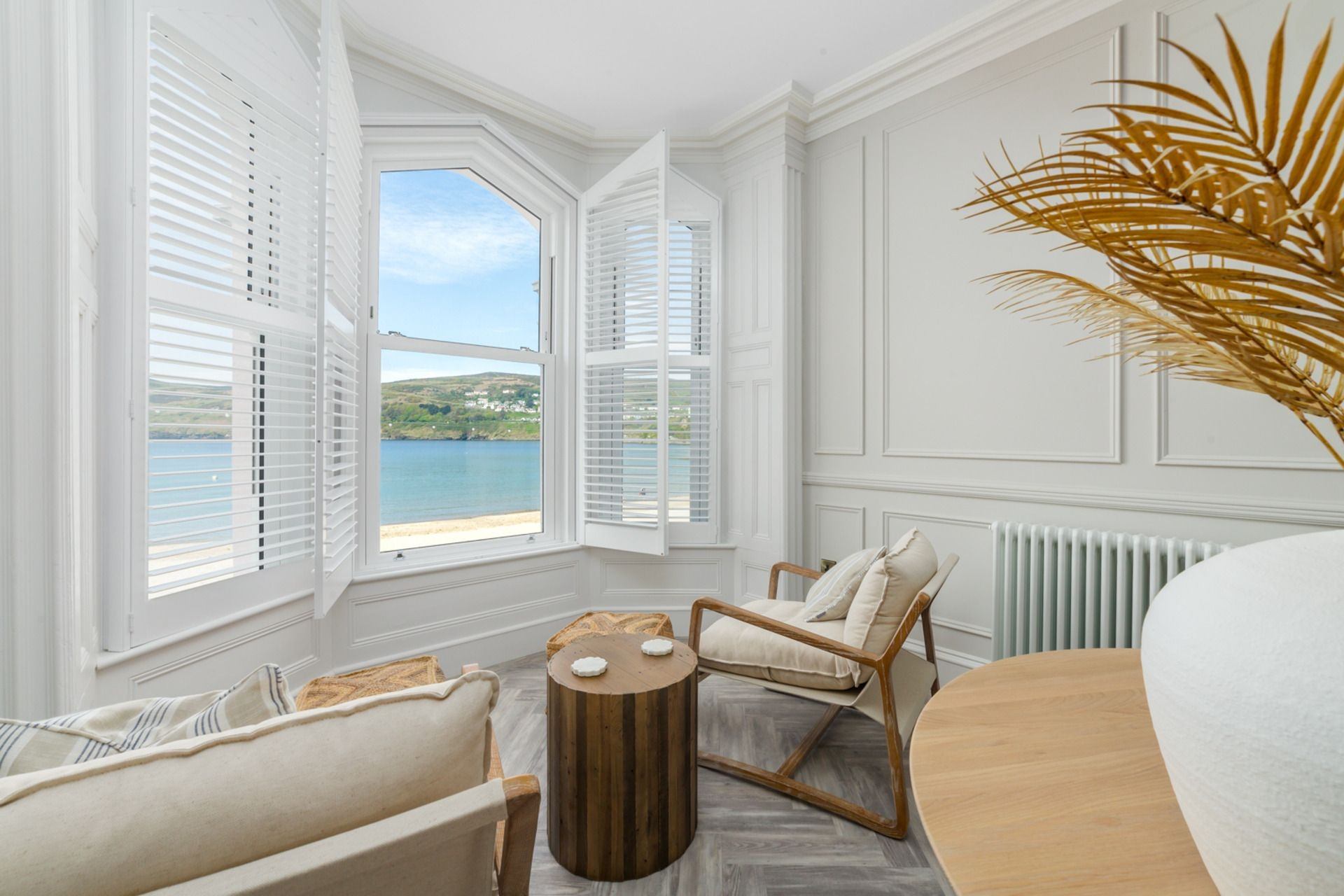 Living room: 4 stylish chairs, plush L-shaped sofa and Smart TV, featuring sea views.