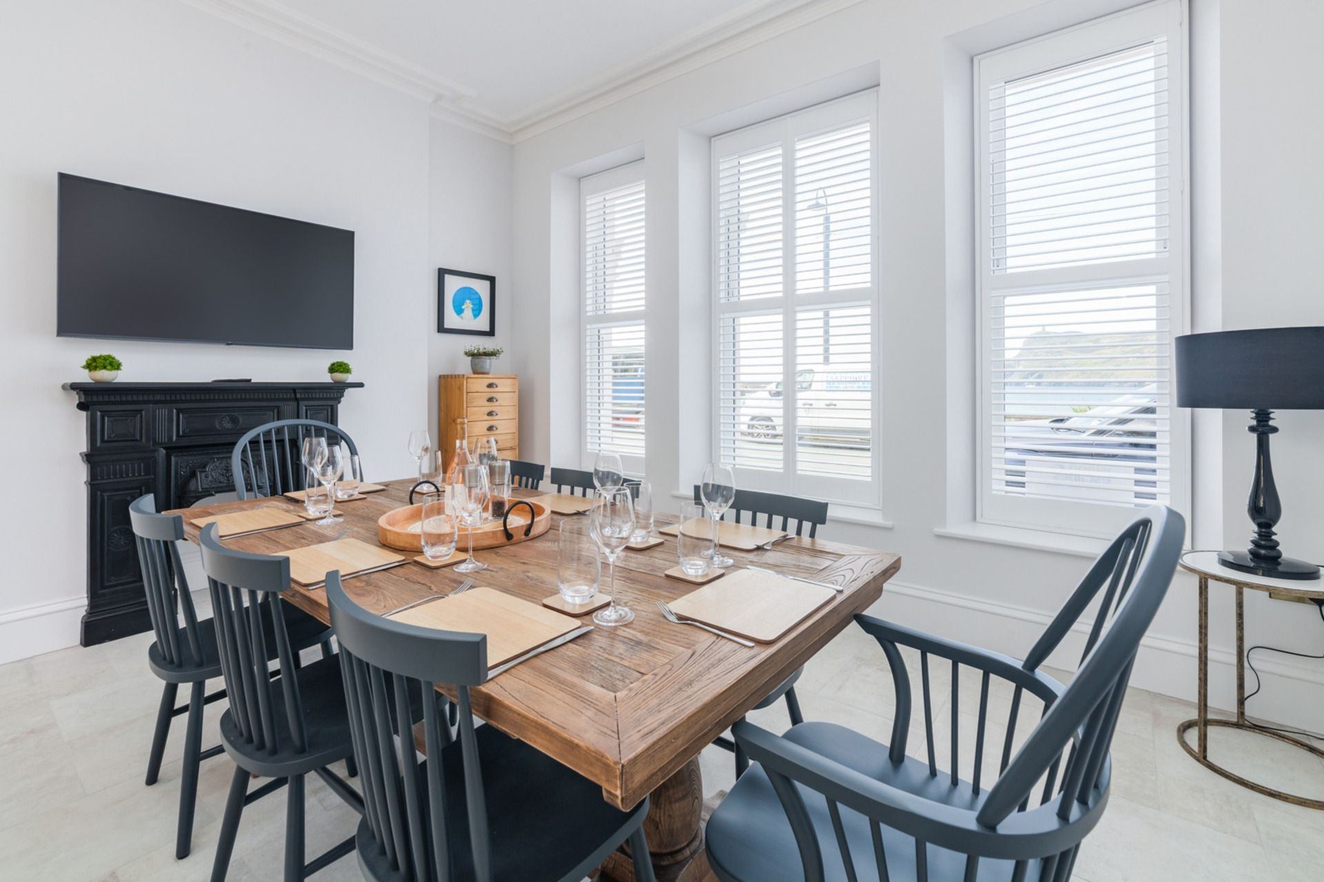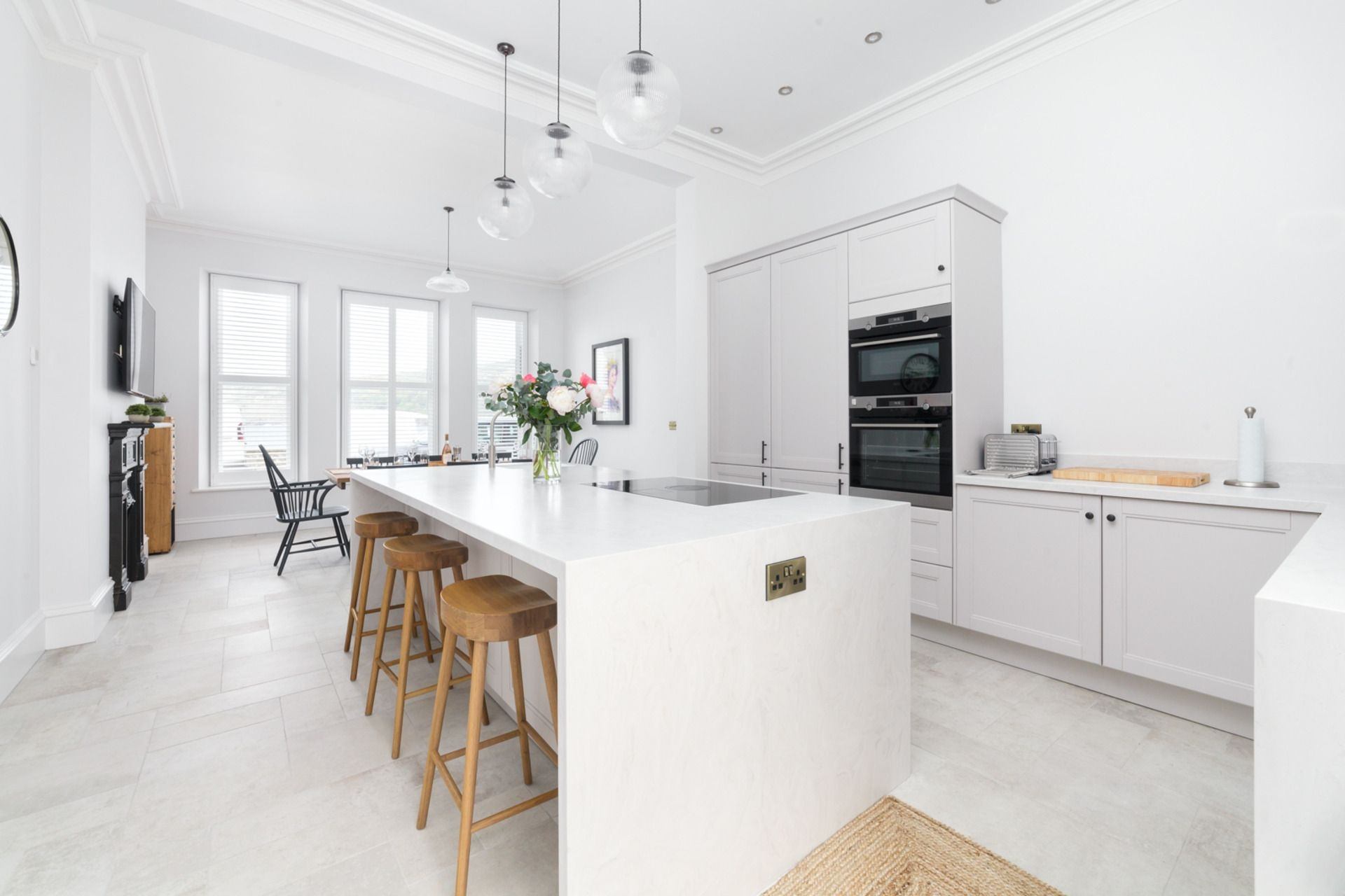 Kitchen & Dining Area: Well-equipped kitchen, featuring oven, hob, microwave, toaster, Nespresso VertuoPlus coffee machine and breakfast bar. Dining area contains table and seating for 8 people, with a large Smart TV. Access to outdoor area via large French doors.