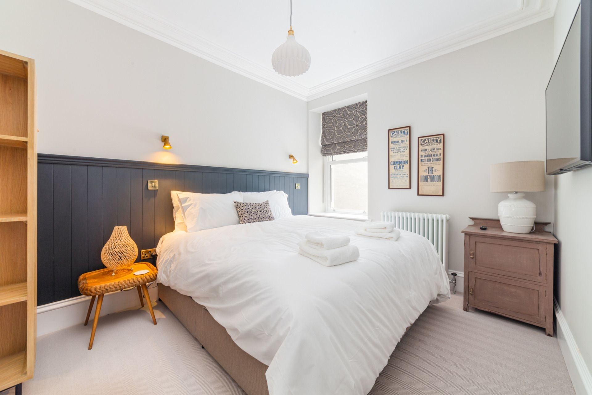 Bedroom 1: Super king size bed (can be configured as twin beds on request), bedside tables, TV and storage space.