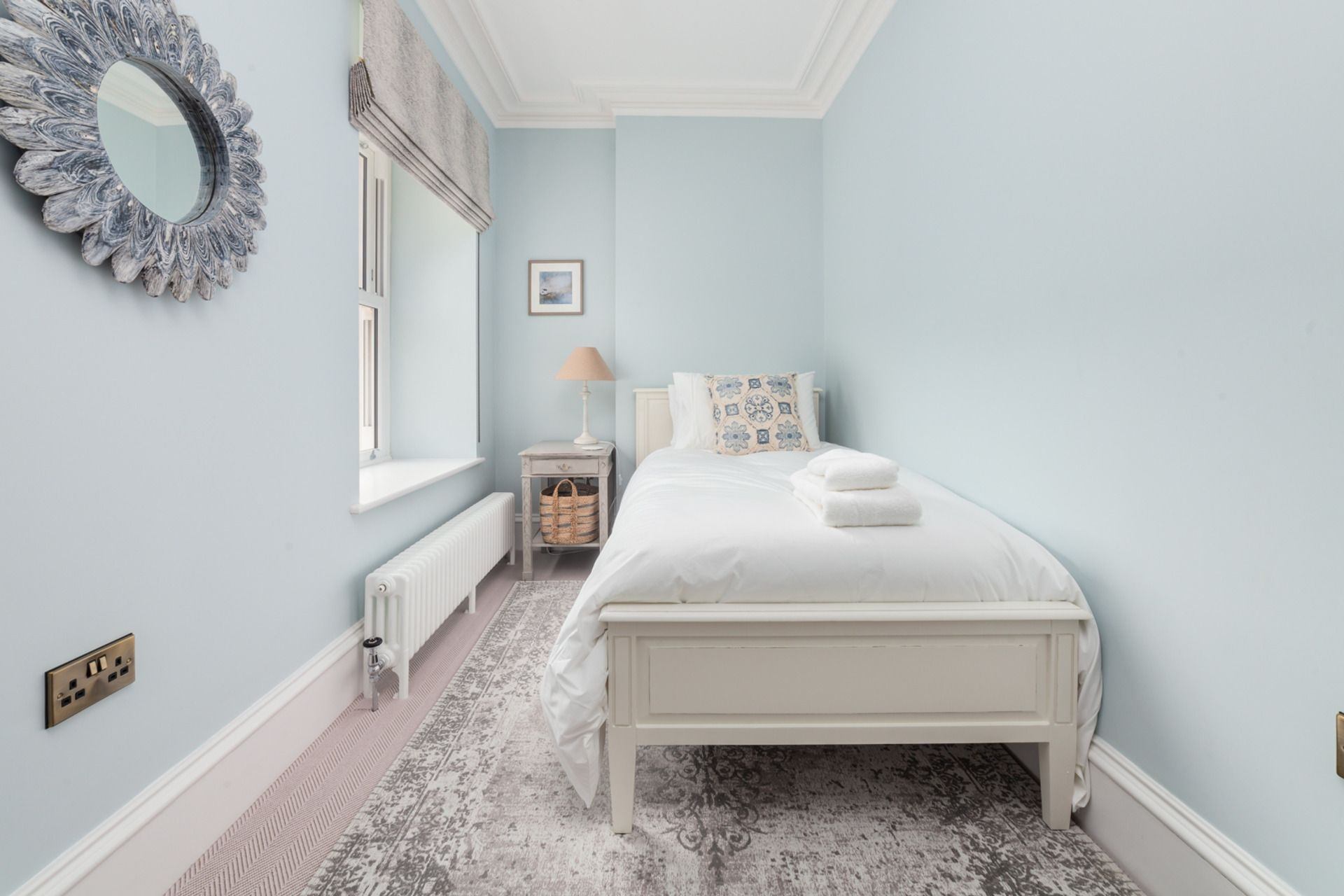 Bedroom 4: Single bed, bedside table, hanging space.