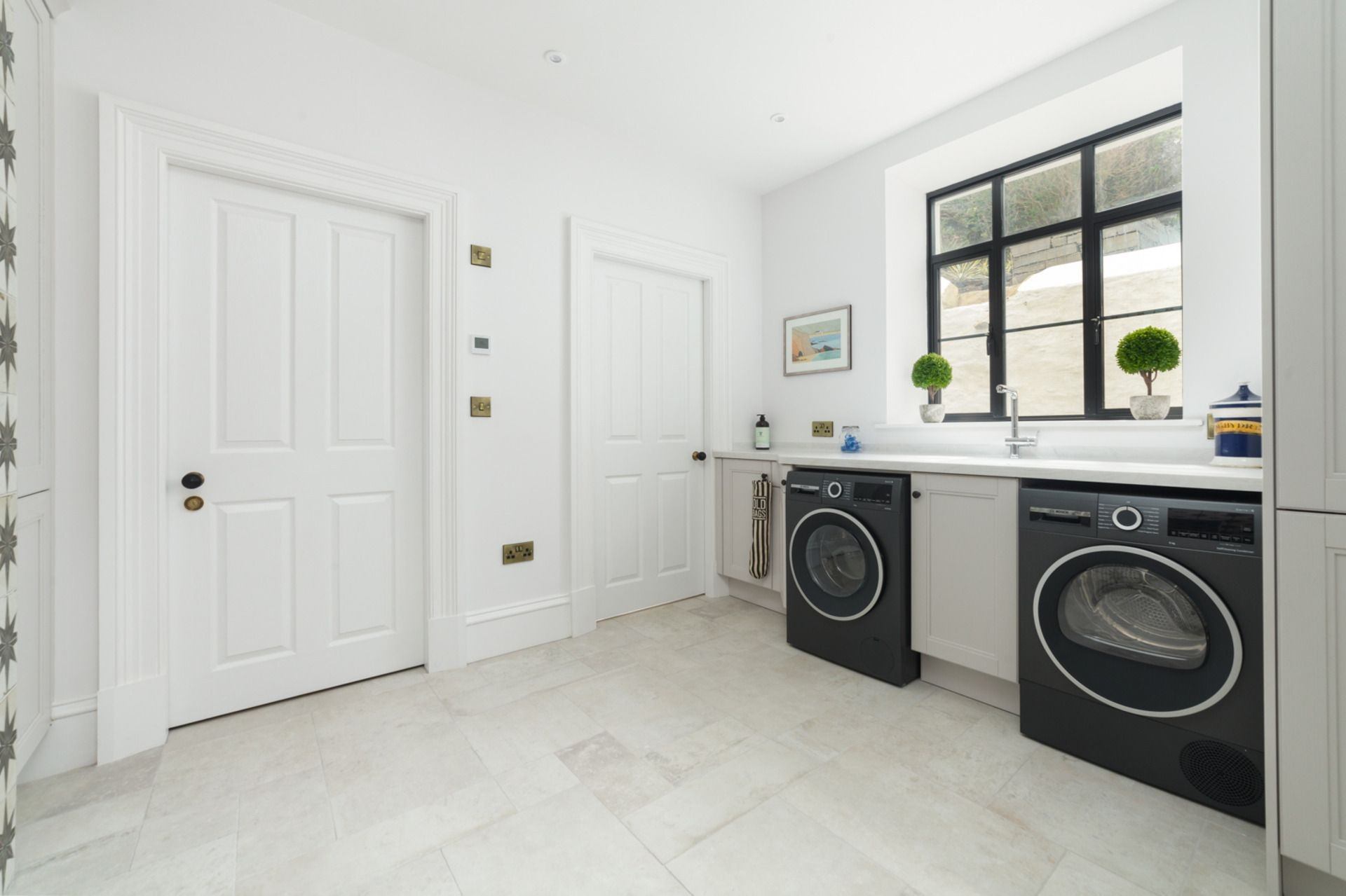 Utility Room: Washing machine, tumble dryer and basin.