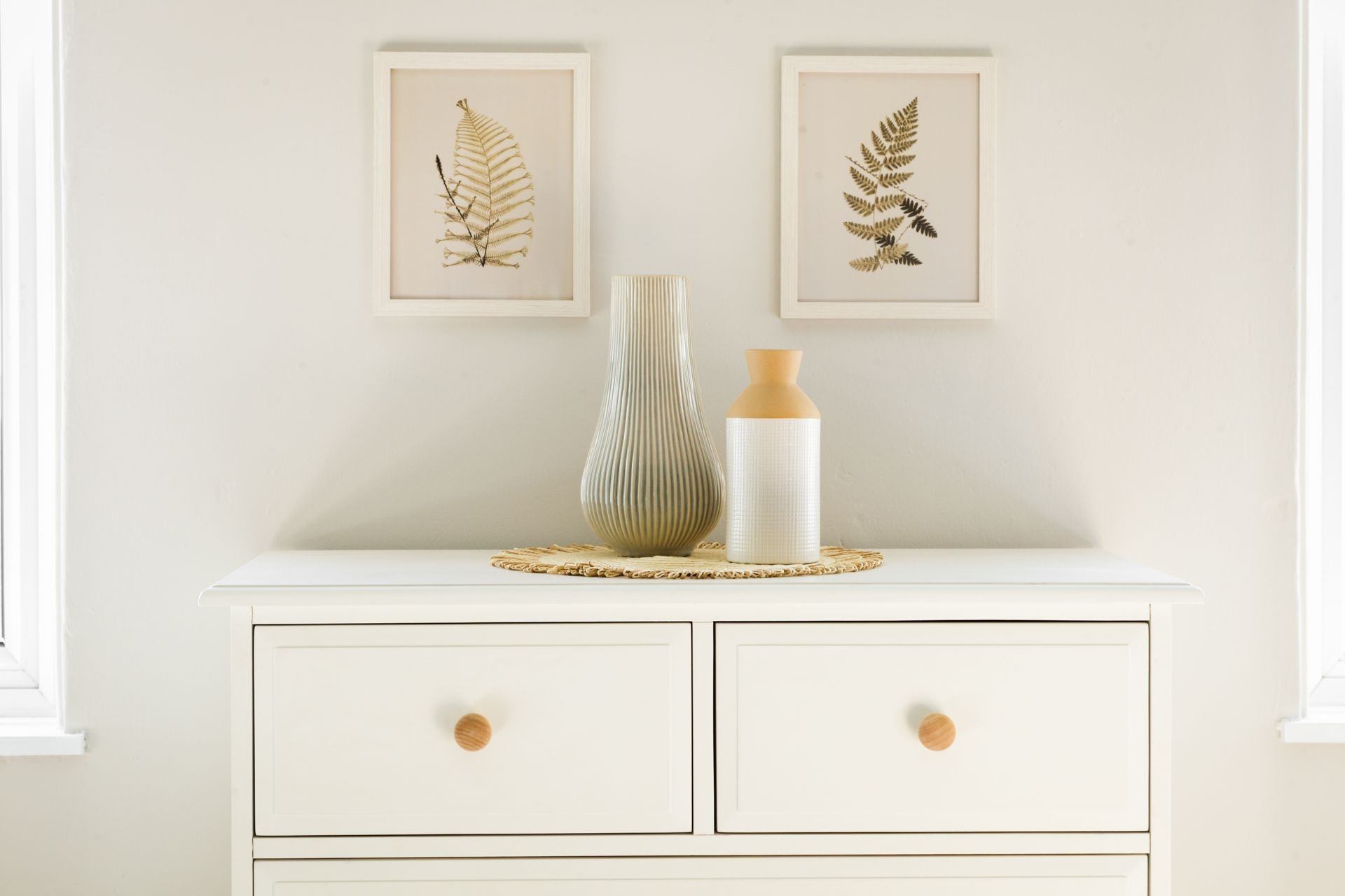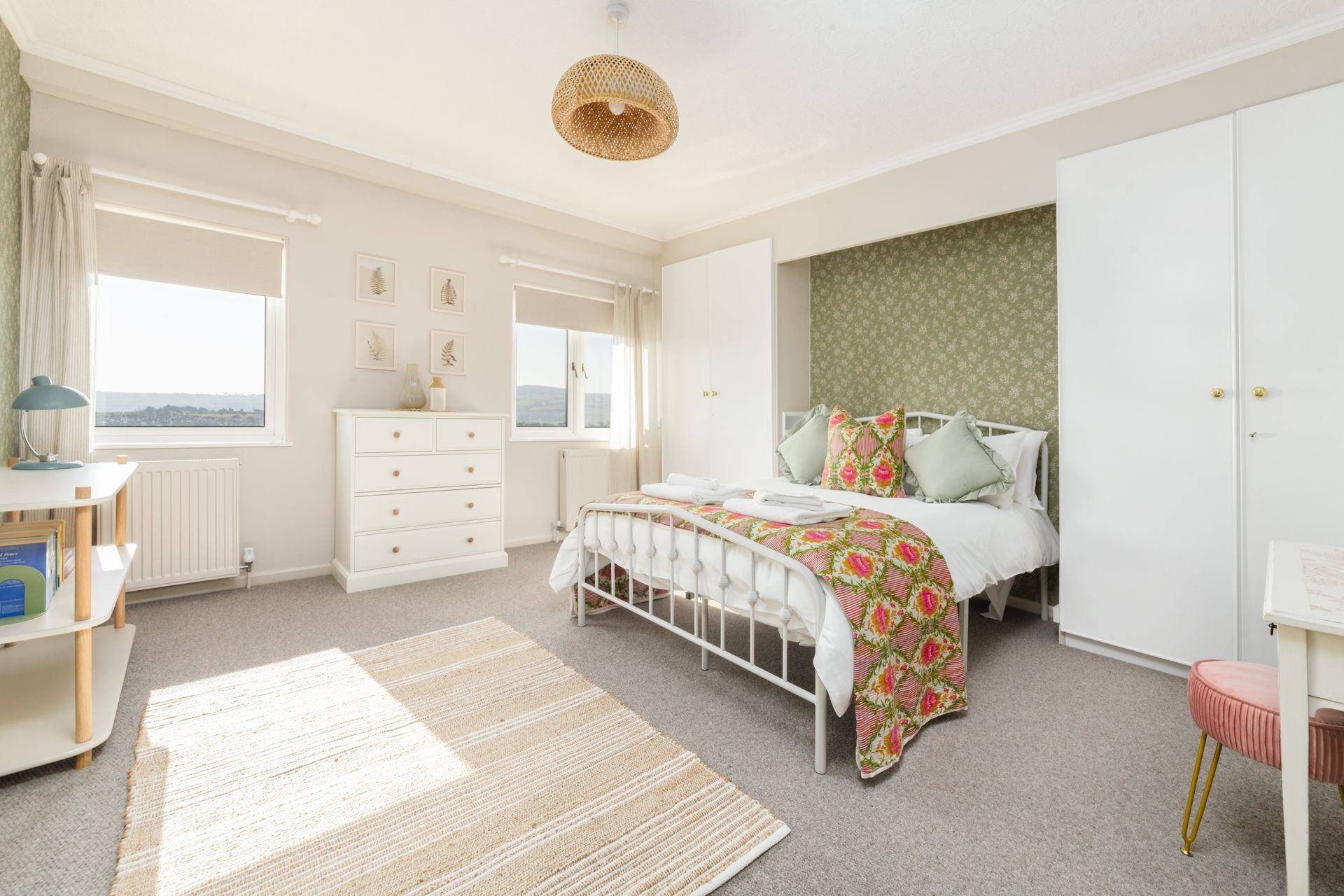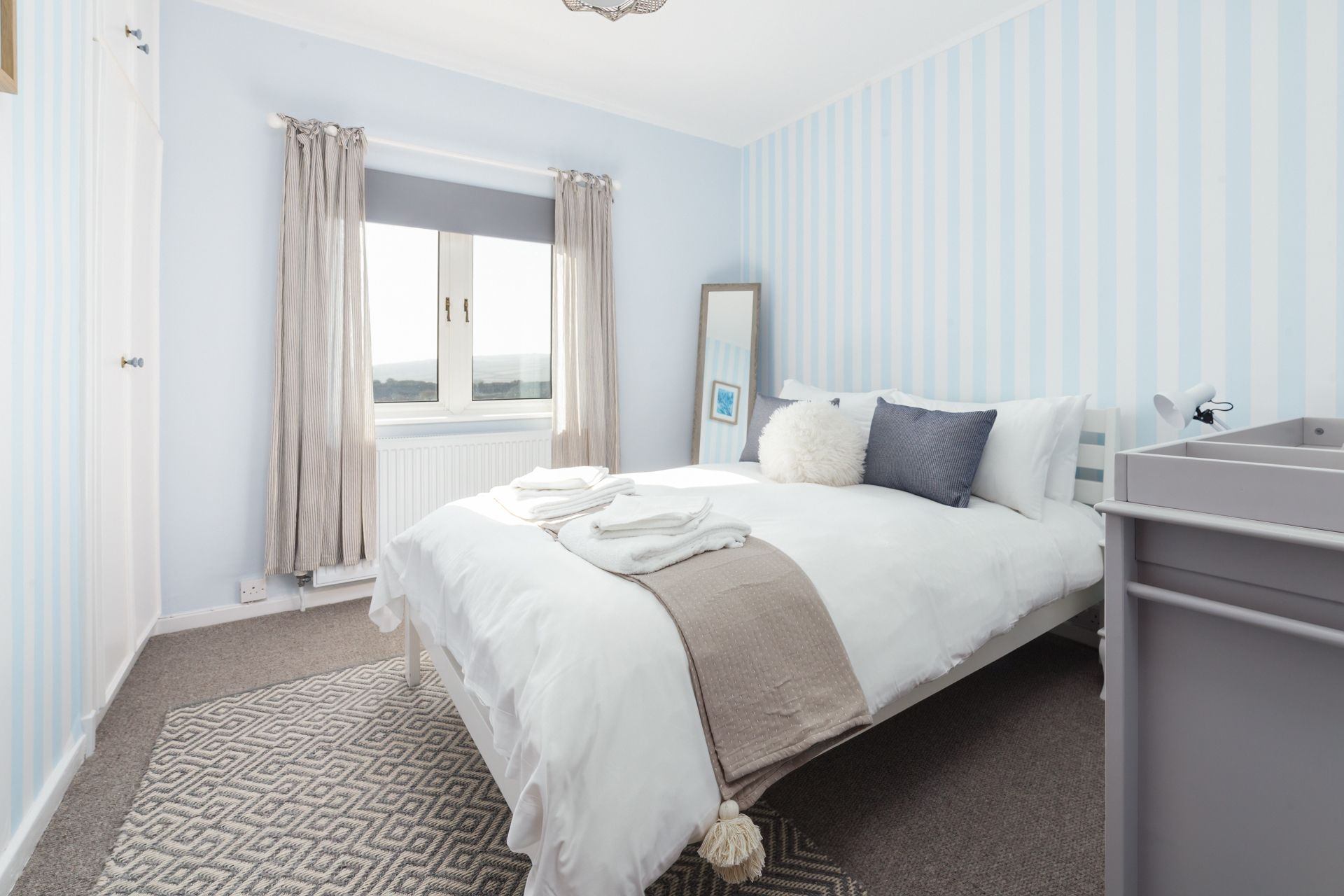 Bedroom 2: Double bed, bedside tables, built-in wardrobe, chest of drawers and table-top for baby changing.