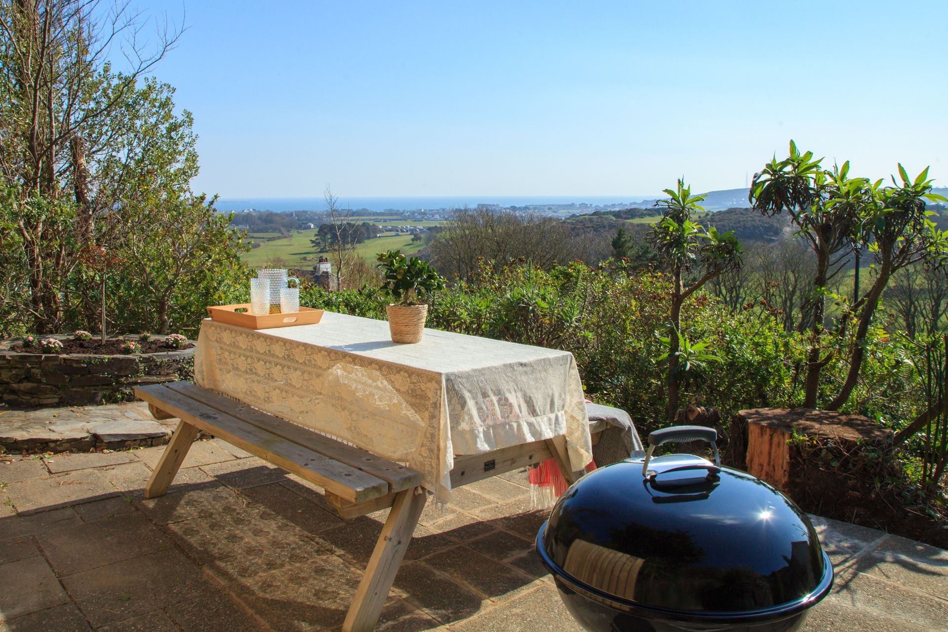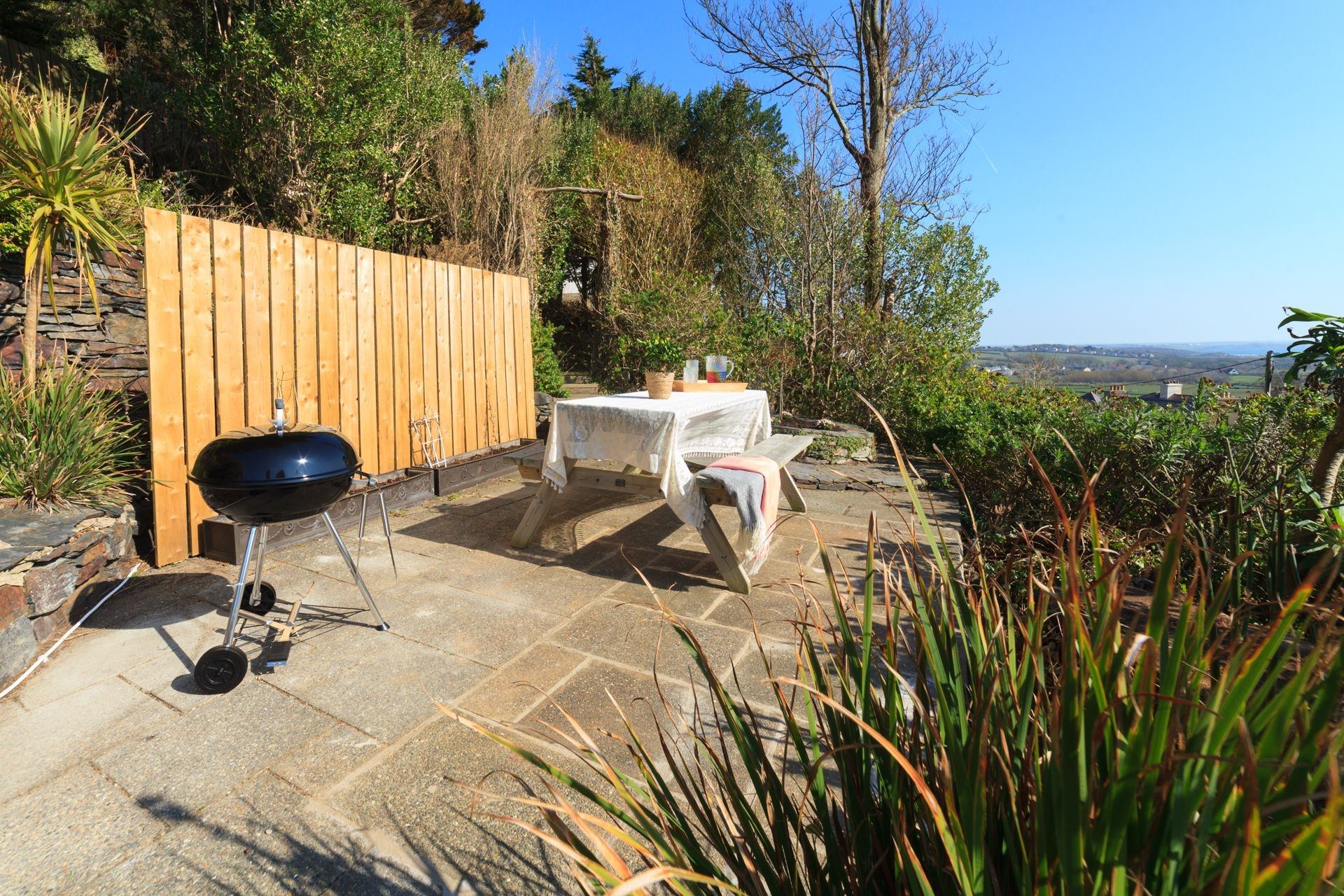 Outdoor: Private patio area with elevated sea views, outdoor furniture and BBQ. Please note this is accessed by an exterior set of steps.