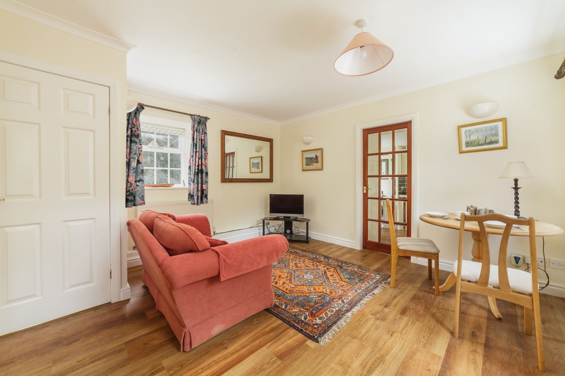 Lounge/Dining area: Sofa, coffee table, TV, Dining room table and 2 chairs