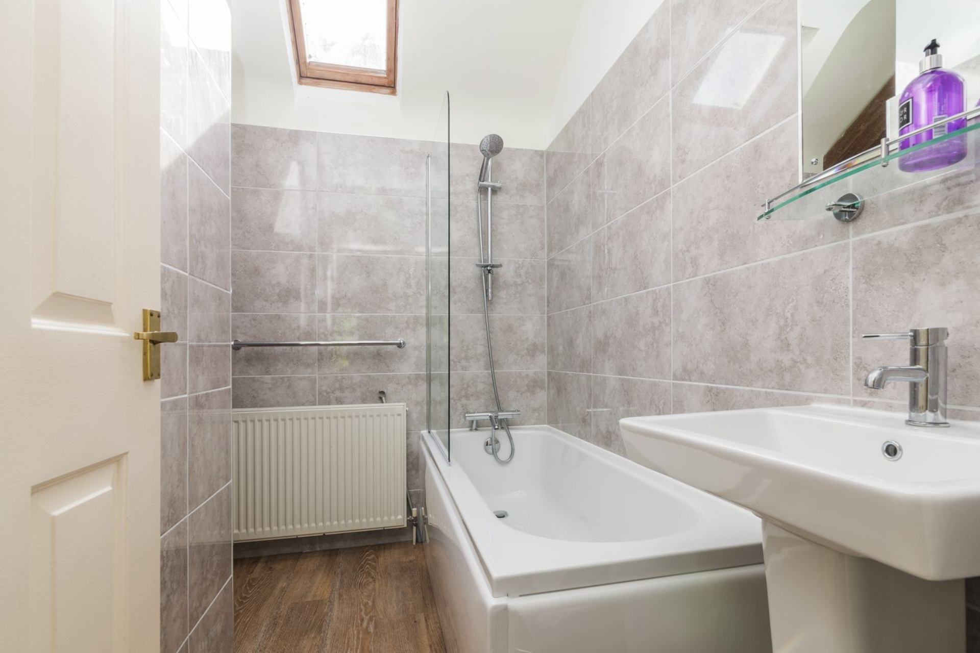 Bathroom: Bath with shower over.